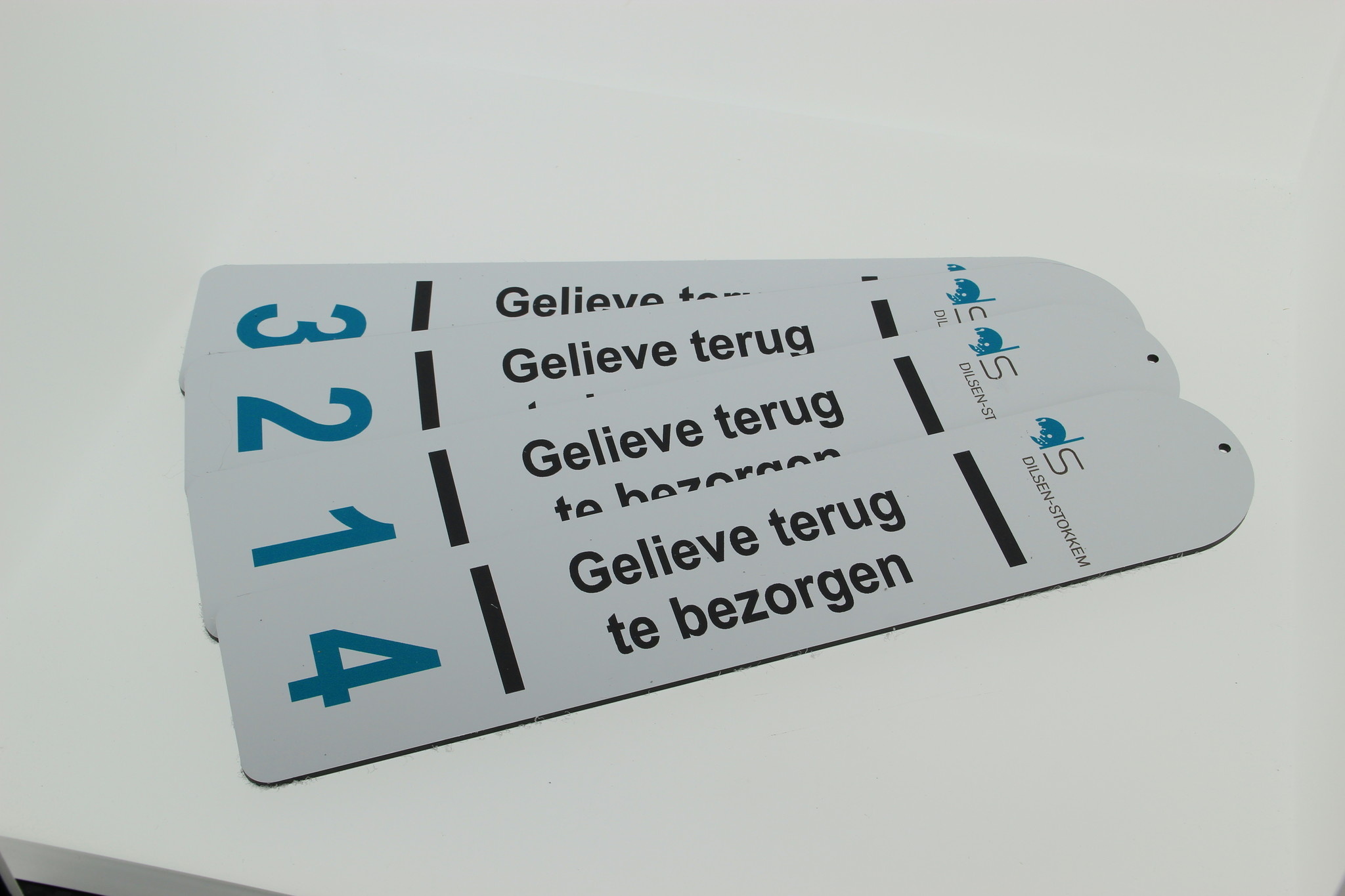 De sleutelhanger wordt bedrukt met een logo, tekst en aansluitend een nummer, zoals weergegeven op de voorbeeldfoto. Vul in de daarvoor bestemde velden je gewenste tekst en nummering in. De nummering kun je op verschillende manieren aanleveren, zoals: