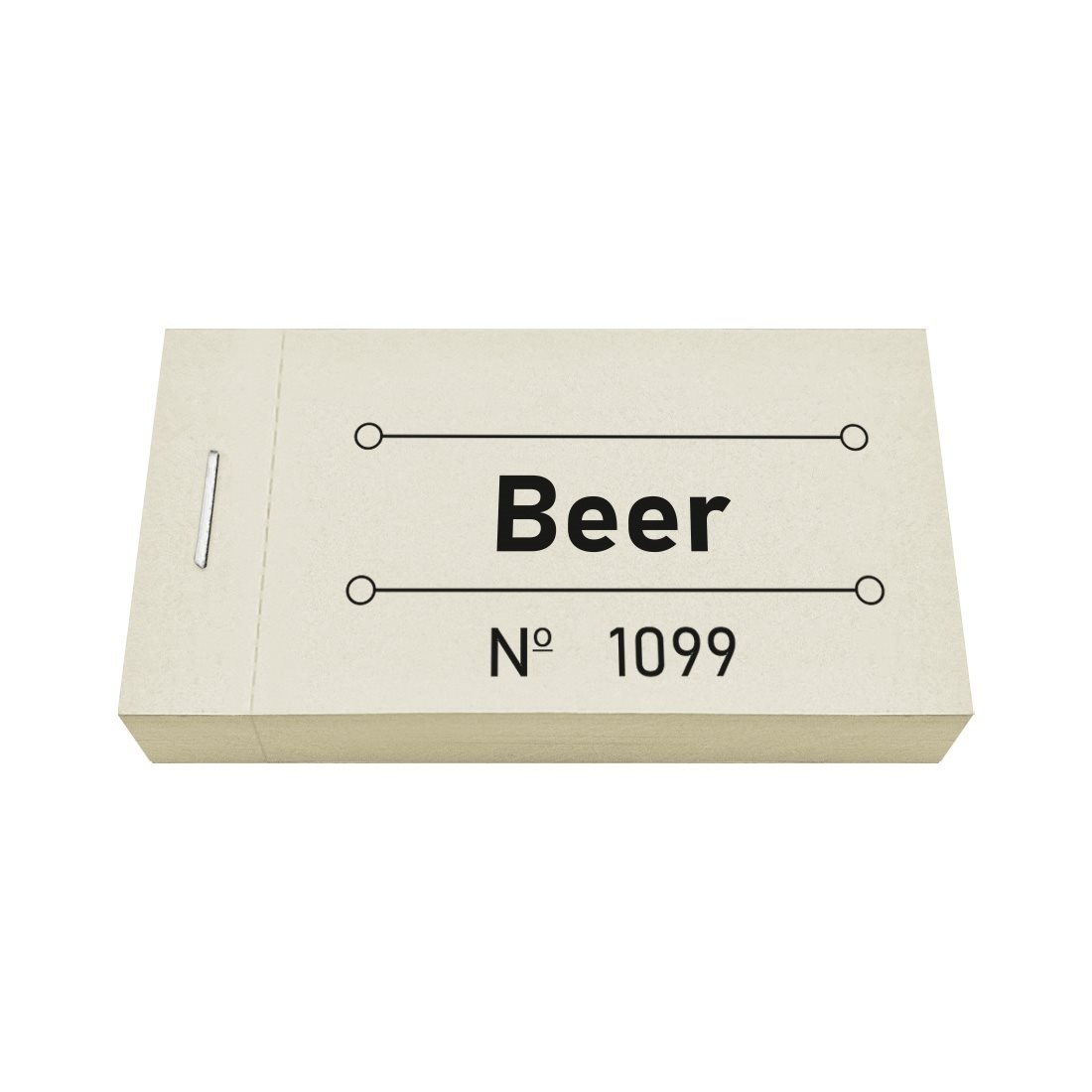 De bonnen zijn voorzien van de Engelse tekst beer (bier) in het zwart met afmetingen van 50 x 30 mm. Alle bonnen worden samengevoegd in een boekje van 60 x 30 mm en bijeen gehouden met een nietje aan de zijkant. Je kunt de bonnen makkelijk uit het boekje scheuren dankzij de perforatielijn aan de zijkant. Het papier is 120 gr/m².