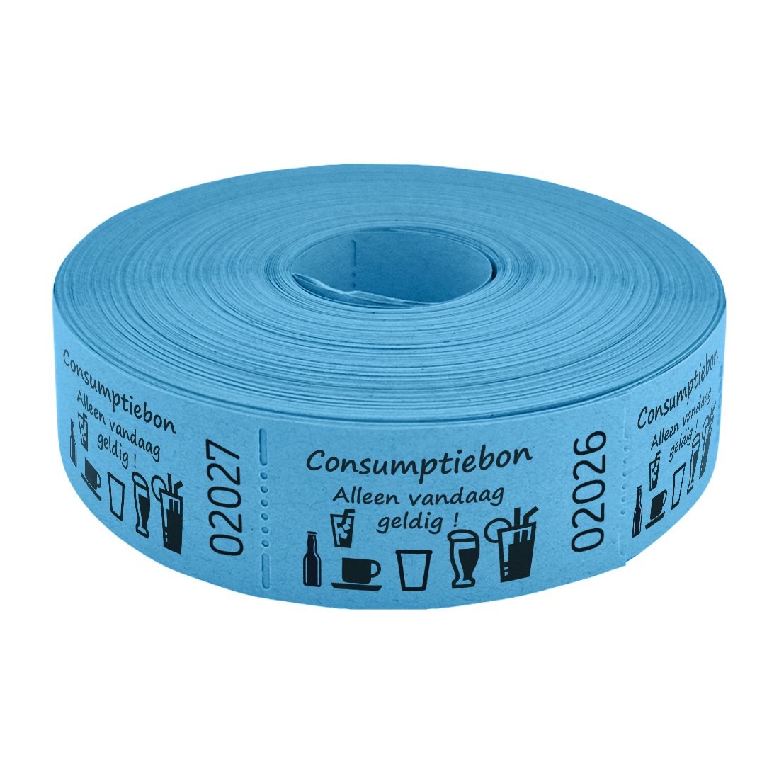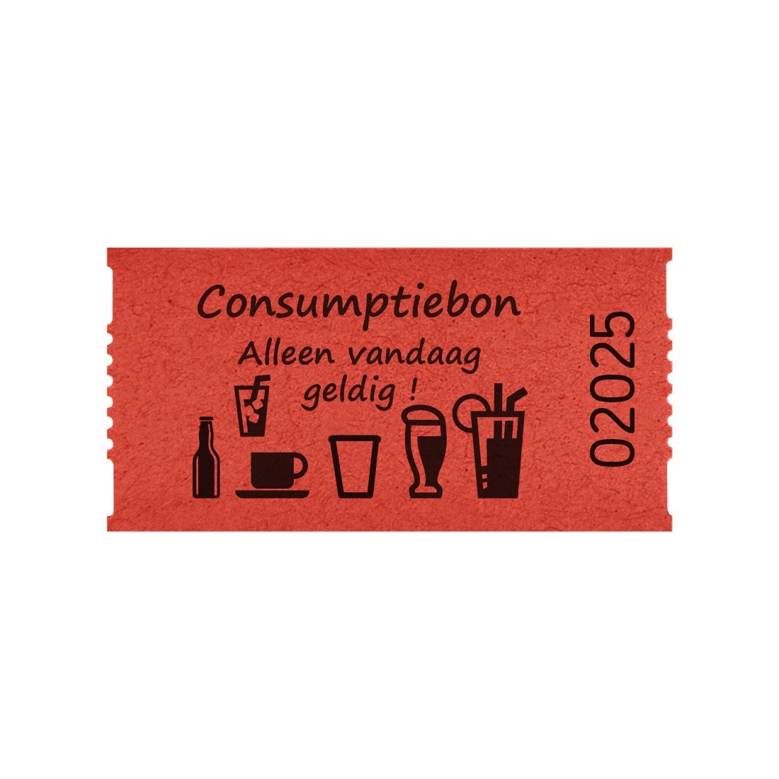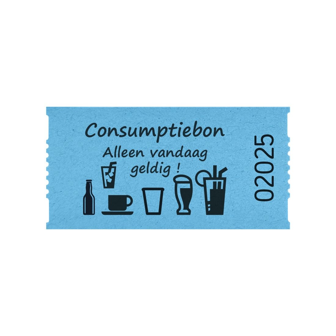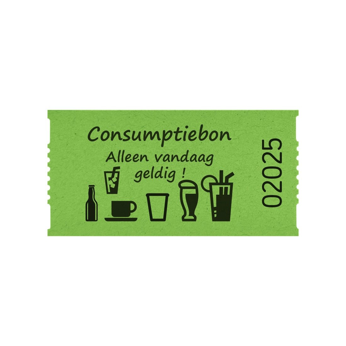De consumptiebonnen op rol hebben een afmeting van 57 x 30 mm. Elke bon is voorzien van verschillende drank iconen en heeft een beperkte geldigheid door de tekst 'Consumptiebon alleen vandaag geldig'. Door de universele drank iconen kun je zelf bepalen welke drankjes iemand kan halen met een consumptiebon. Organiseer je een evenement dat meerdere dagen duurt? Dan is het mogelijk om meerdere kleuren in te kopen en voor elke dag een specifieke kleur te gebruiken.
