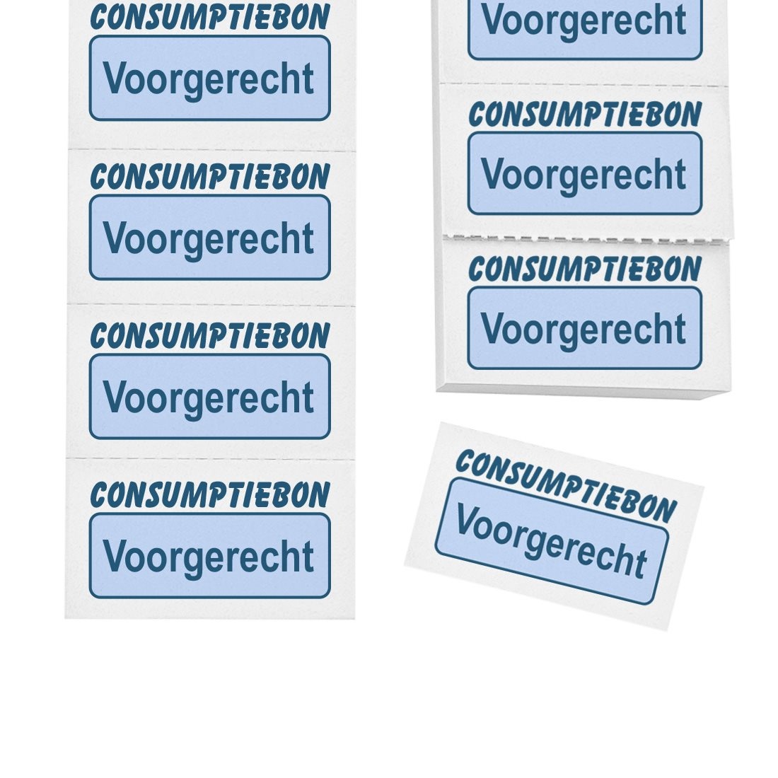 De witte bonnen hebben een blauwe opdruk en bevatten de tekst voorgerecht. Elke bon heeft een afmeting van 50 x 27,5 mm. Ze zijn gemaakt van 160 gr/m² papier, wat ervoor zorgt dat ze niet gemakkelijk vocht opnemen. De bonnen zijn verdeeld over twee boekjes van 50 x 285 x 10 mm, waarbij elk boekje 50 strips bevat met op elke strip 10 consumptiebonnen. In totaal ontvang je 1000 bonnen, die dankzij de perforatiestrook eenvoudig van elkaar af te scheuren zijn.