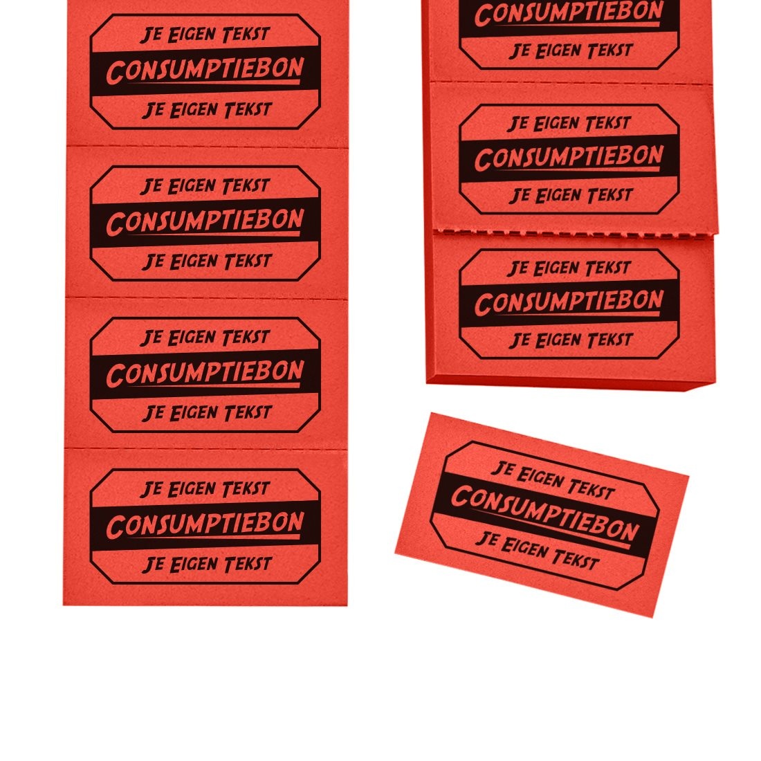 Laat je eigen consumptiebonnen bedrukken bij CombiCraft. Handig voor feestjes, toernooien of verenigingsactiviteiten. Deze gekleurde bon bevat de tekst 'consumptiebon' en kun je voorzien van 2 regels eigen tekst. Elke regel mag bestaan uit maximaal 20 tekens (inclusief spaties en leestekens).