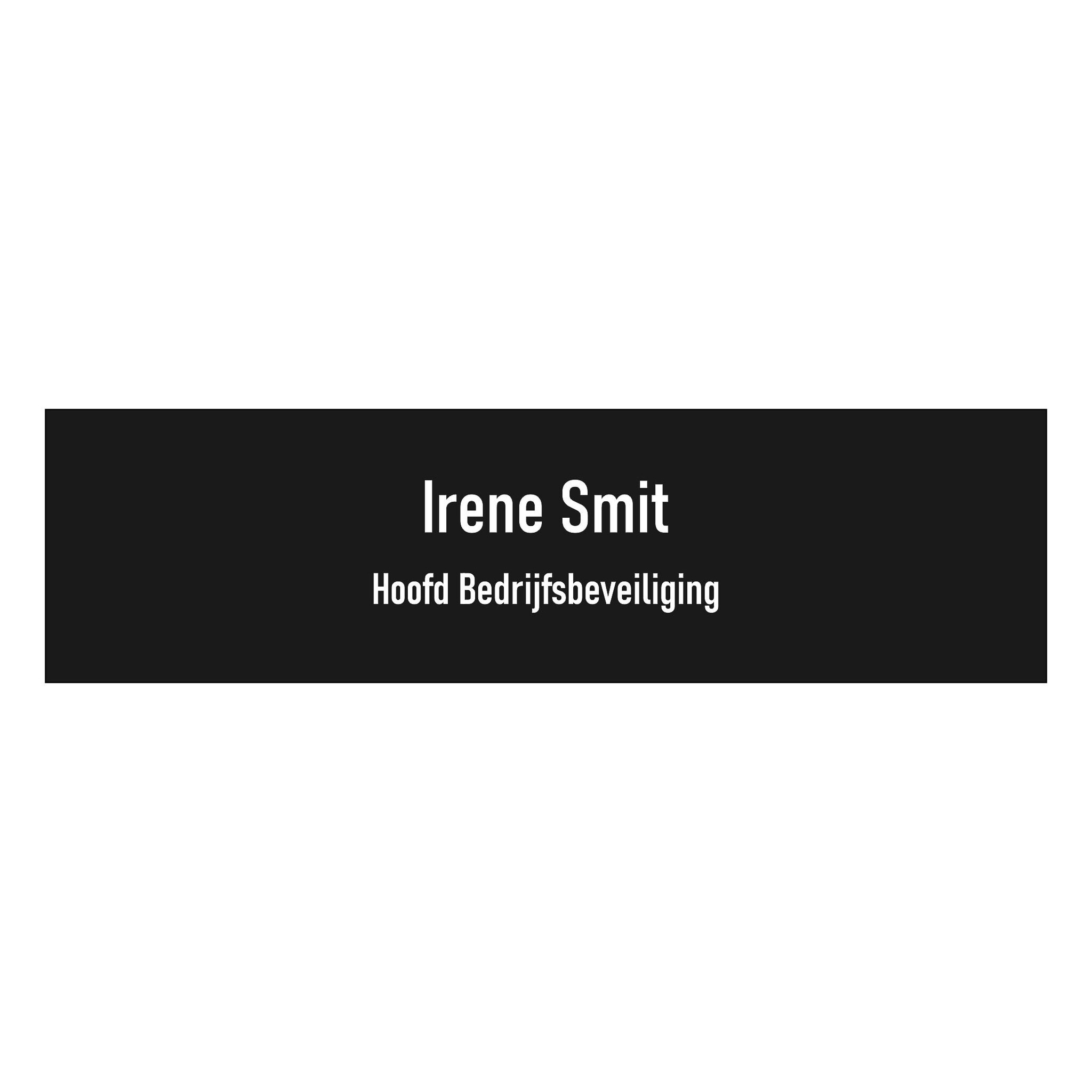 Deurbordje van 165 x 45 mm met jouw eigen naam en titel. Dit zwarte deurbordje bevestig je eenvoudig met de 3M-tape op de achterkant. Geschikt voor binnen- en buitengebruik. Per 1 stuk.