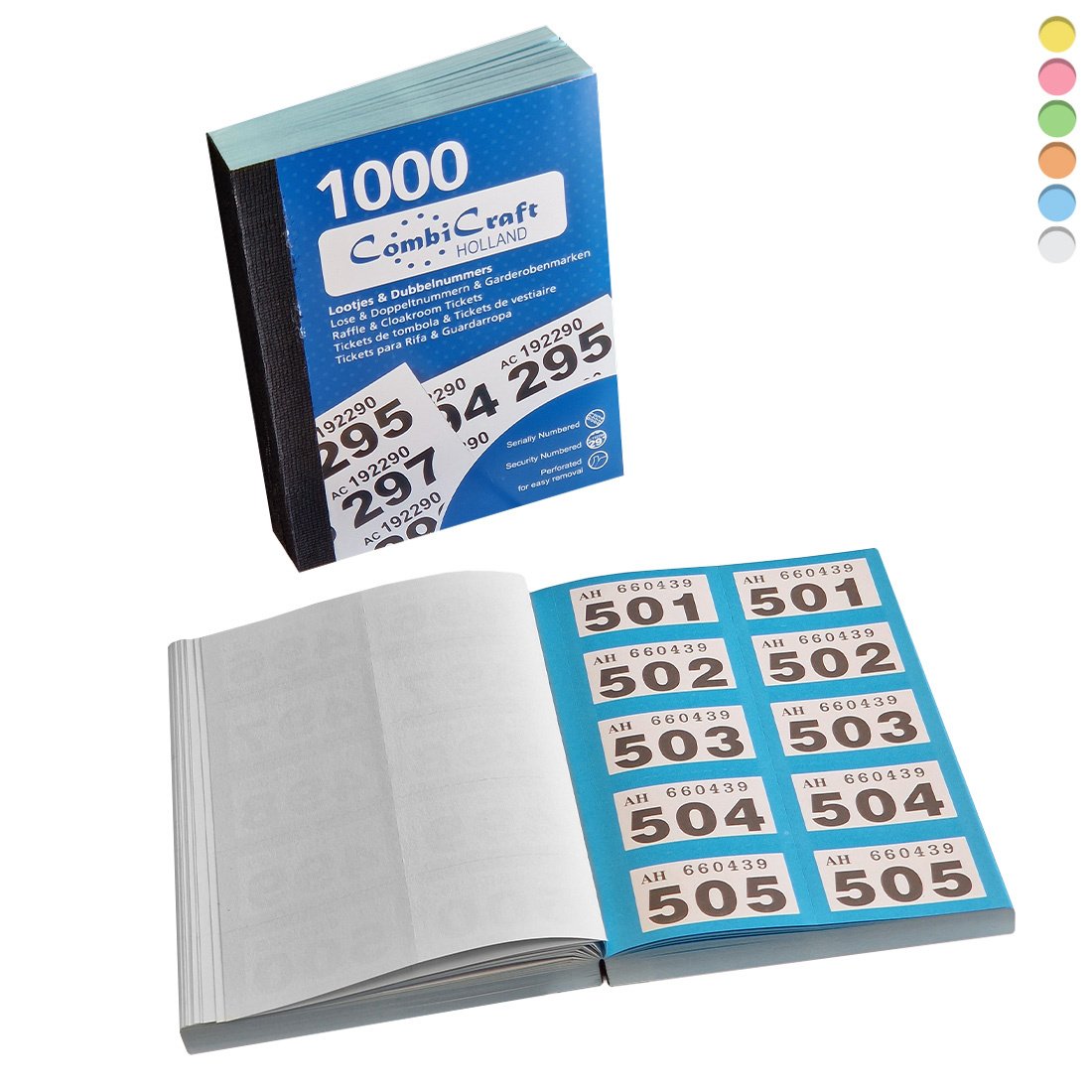 De dubbelnummers zijn gemaakt van papier en zitten in een boekje van 150 x 140 mm. Ze zijn verkrijgbaar in de kleuren wit, geel, oranje, roze, blauw en groen. In een boekje zitten 1000 dubbele nummers, genummerd van 1 tot en met 1000. Naast de nummering staat er een controlenummer op het dubbelnummer. Dankzij de handige perforatiestrook scheur je de nummers eenvoudig uit het boekje. Dit zorgt voor een snelle afgifte, ook tijdens drukke momenten.