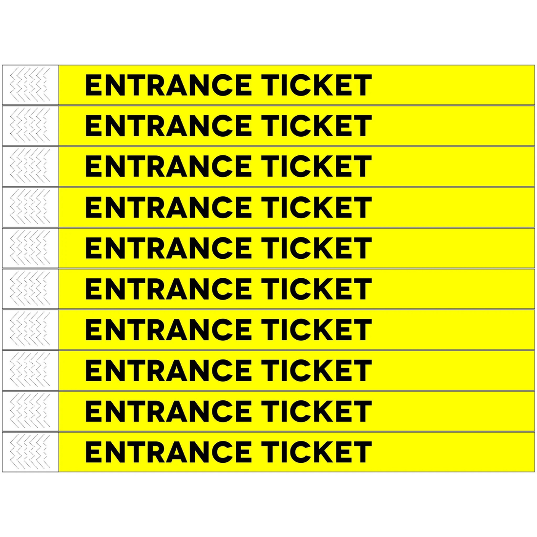 De Tyrex polsbandjes zijn zwart bedrukt met de tekst ‘Entrance ticket’ en hebben afmetingen van 248 x 19 mm. Ze zijn voorzien van een nummering en een sterke plakstrook met veiligheidsbevestiging. De polsbandjes worden geleverd op vellen, waarbij de bandjes gemakkelijk van elkaar los te scheuren zijn. Je ontvangt 10 vellen met op elk vel 10 bandjes. In totaal ontvang je 100 polsbandjes. Daarnaast is het mogelijk om de bandjes extra te beschrijven met een balpen of een watervaste stift.