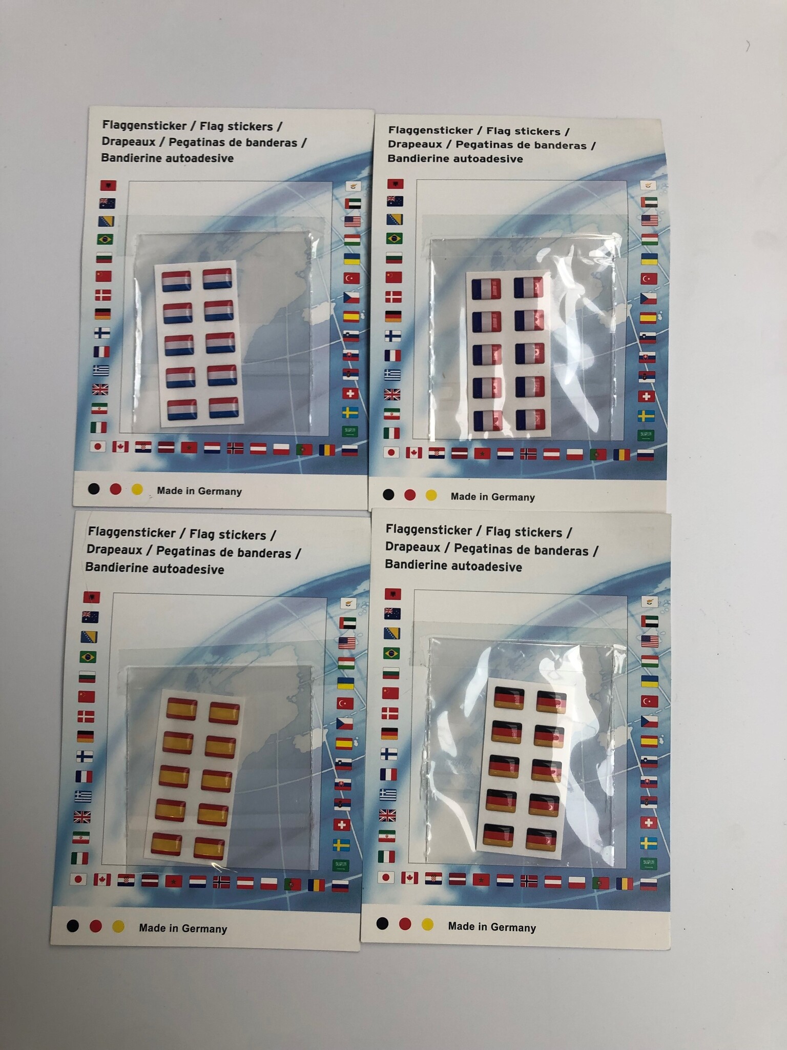 Vlaggensticker van Frankrijk, Nederland, Duitsland en Spanje.