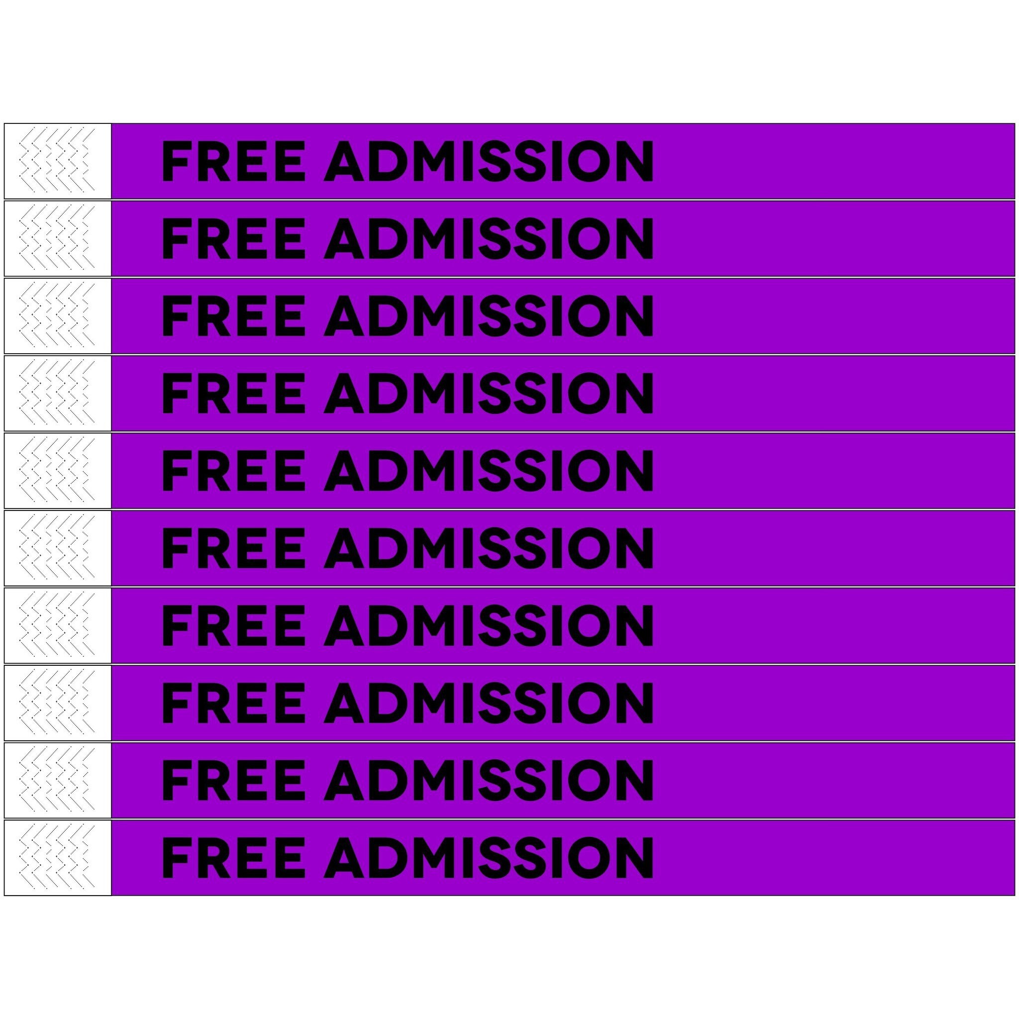 De Tyrex polsbandjes zijn zwart bedrukt met de tekst ‘Free admission’ en hebben afmetingen van 248 x 19 mm. Ze zijn voorzien van een nummering en een sterke plakstrook met veiligheidsbevestiging. Zowel kinderen als volwassenen kunnen deze polsbandjes dragen. De polsbandjes worden geleverd op vellen, waarbij de bandjes gemakkelijk van elkaar los te scheuren zijn. Je ontvangt 10 vellen met op elk vel 10 bandjes. In totaal ontvang je 100 polsbandjes. Daarnaast is het mogelijk om de bandjes extra te beschrijven met een balpen of een watervaste stift.
