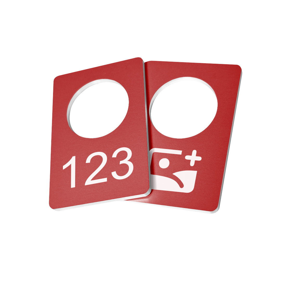 De Hamony garderobemunten zijn gemaakt van slijtvast geëloxeerd aluminium en hebben een afmeting van 30 x 45 mm en een dikte van 2 mm. Elke munt is voorzien van een rond ophanggat van Ø 20 mm. We graveren de garderobemunten met een eigen nummering. Je kunt elke gewenste nummering opgeven, zoals:
