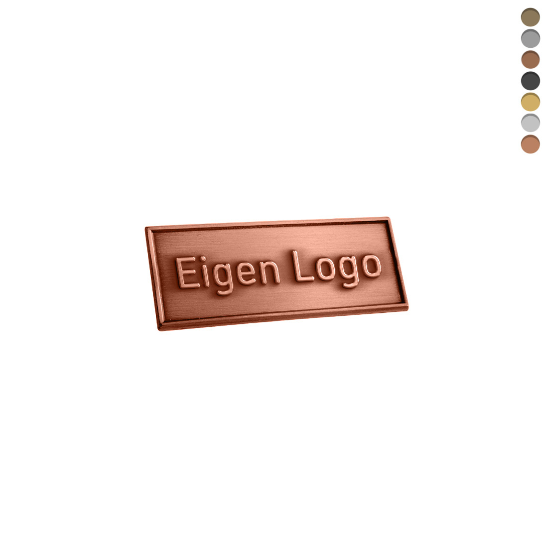 Het rechthoekige gegoten logo plaatje is gemaakt van gietmetaal, een legering van brons en ijzer. Het heeft een afmeting van 40 x 15 mm en een dikte van 2 mm. Je kunt kiezen uit verschillende metaal- en hoekafwerkingen, die je eenvoudig bij het product selecteert. Het wordt standaard zonder bevestiging geleverd, maar tegen een meerprijs voorzien van tape aan de achterzijde voor snelle en gemakkelijke montage. De gegoten logo plaatjes zijn geschikt voor zowel binnen- als buitengebruik en verkrijgbaar per stuk, vanaf 100 stuks.