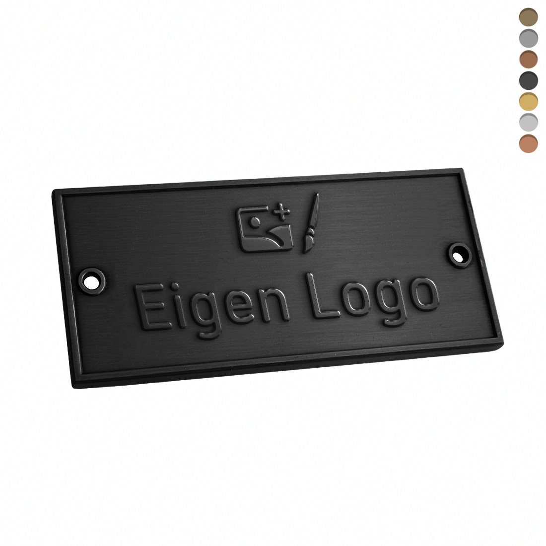 Het rechthoekige gegoten logo plaatje is gemaakt van gietmetaal, een legering van brons en ijzer. Het heeft een afmeting van 70 x 35 mm en een dikte van 2 mm. Je kunt kiezen uit verschillende metaal- en hoekafwerkingen, die je eenvoudig bij het product selecteert. Het wordt standaard geleverd met 2 gaten, passend bij het gekozen ontwerp. Het is ook mogelijk om een eigen gatgrootte op te geven. De gegoten logo plaatjes zijn geschikt voor zowel binnen- als buitengebruik en verkrijgbaar per stuk, vanaf 100 stuks.