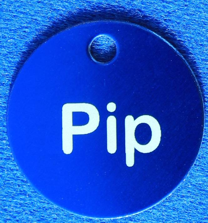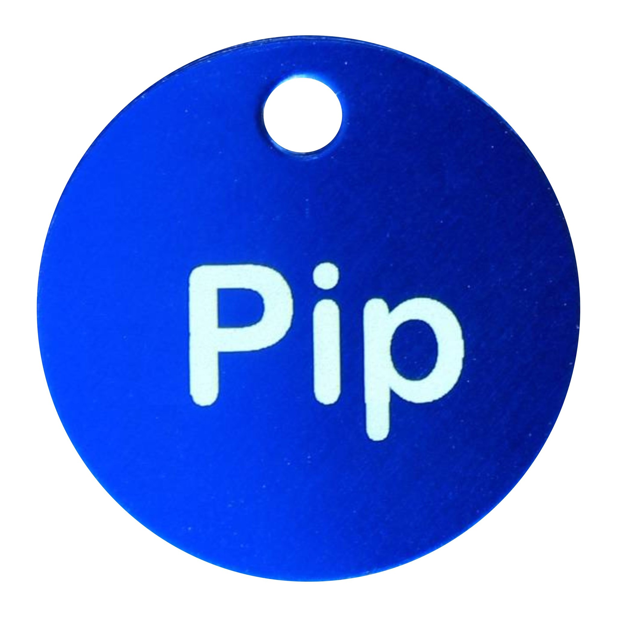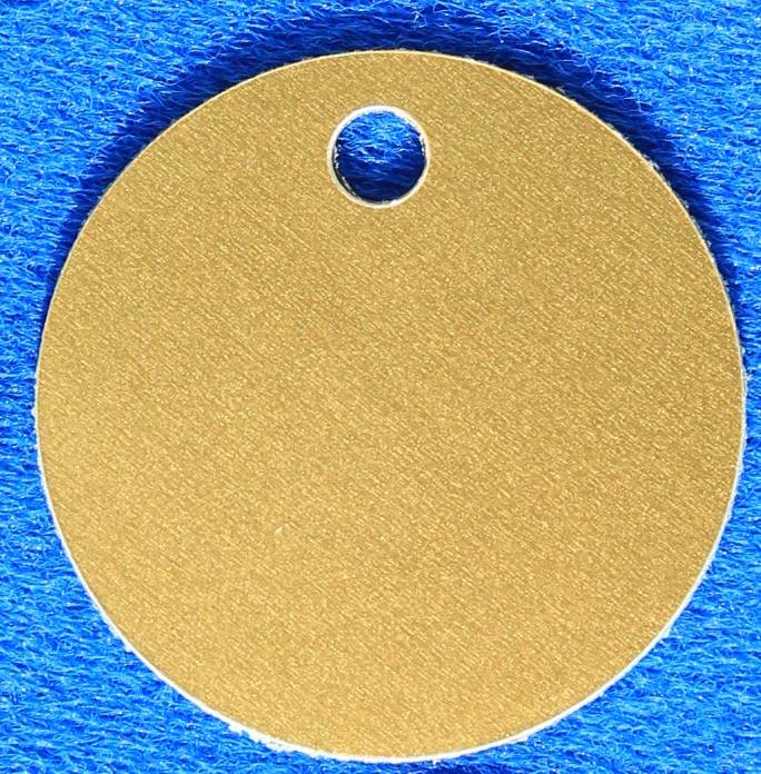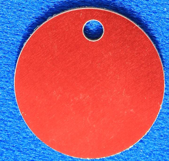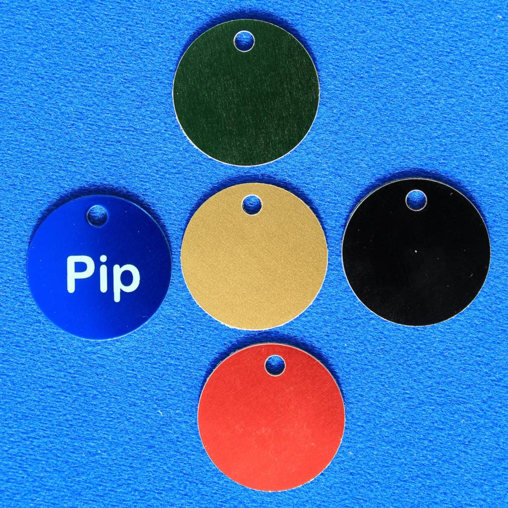 Aluminium ronde dierenpenning met een inwendig oog (= type 1) Deze penning van Ø30mm is verkrijgbaar in diverse kleuren. Er is ruimte voor maximaal 2 x 12 karakters gravering op de voorzijde.