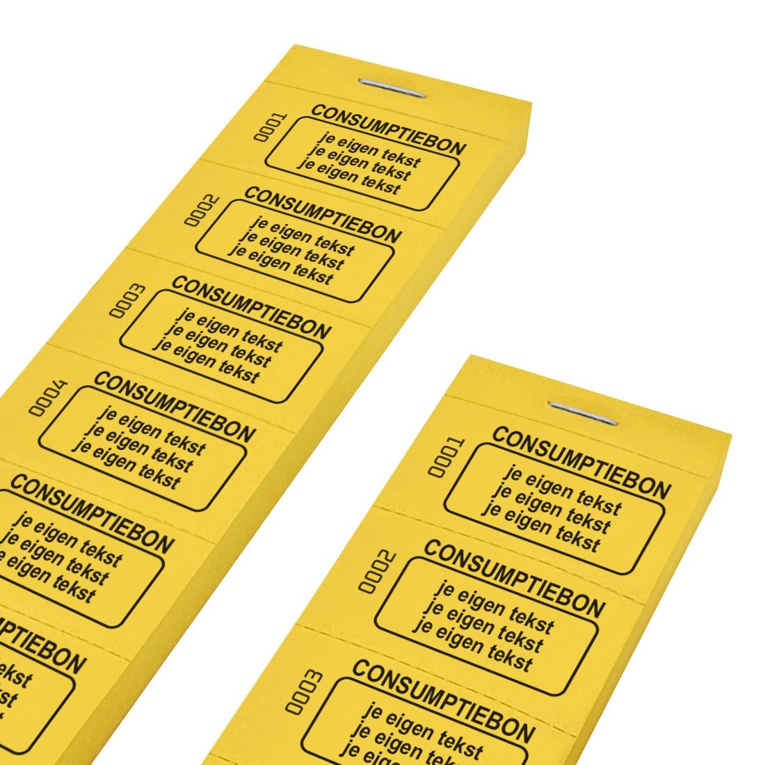 Consumptiebonnen met eigen bedrukking zijn ideaal voor een feest, toernooi, bar, keet of sportvereniging. Met een consumptiebon gaan transacties snel en foutloos. Bovendien zijn de bonnen voorzien van een unieke nummering, wat de kans op fraude verkleint.