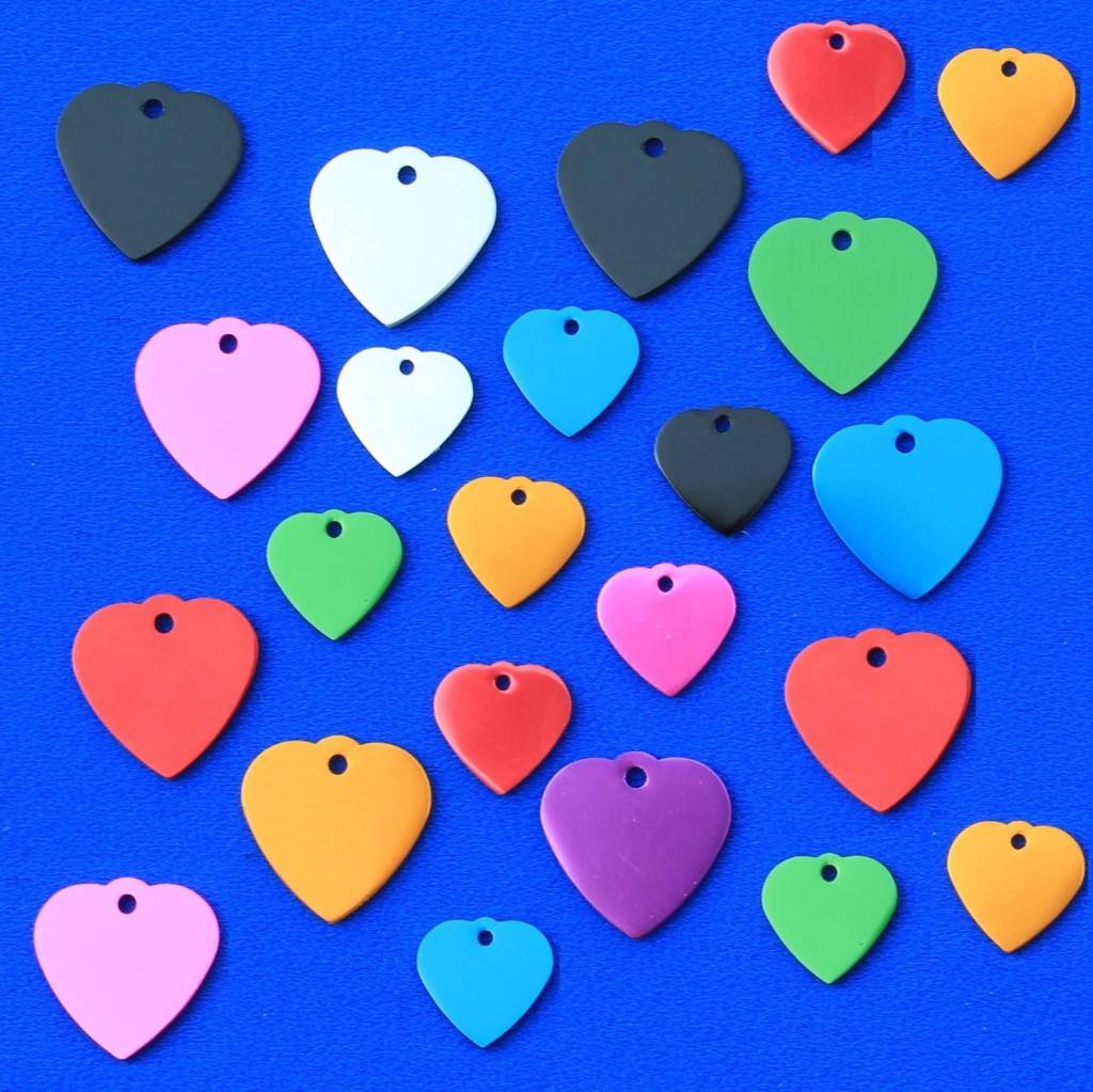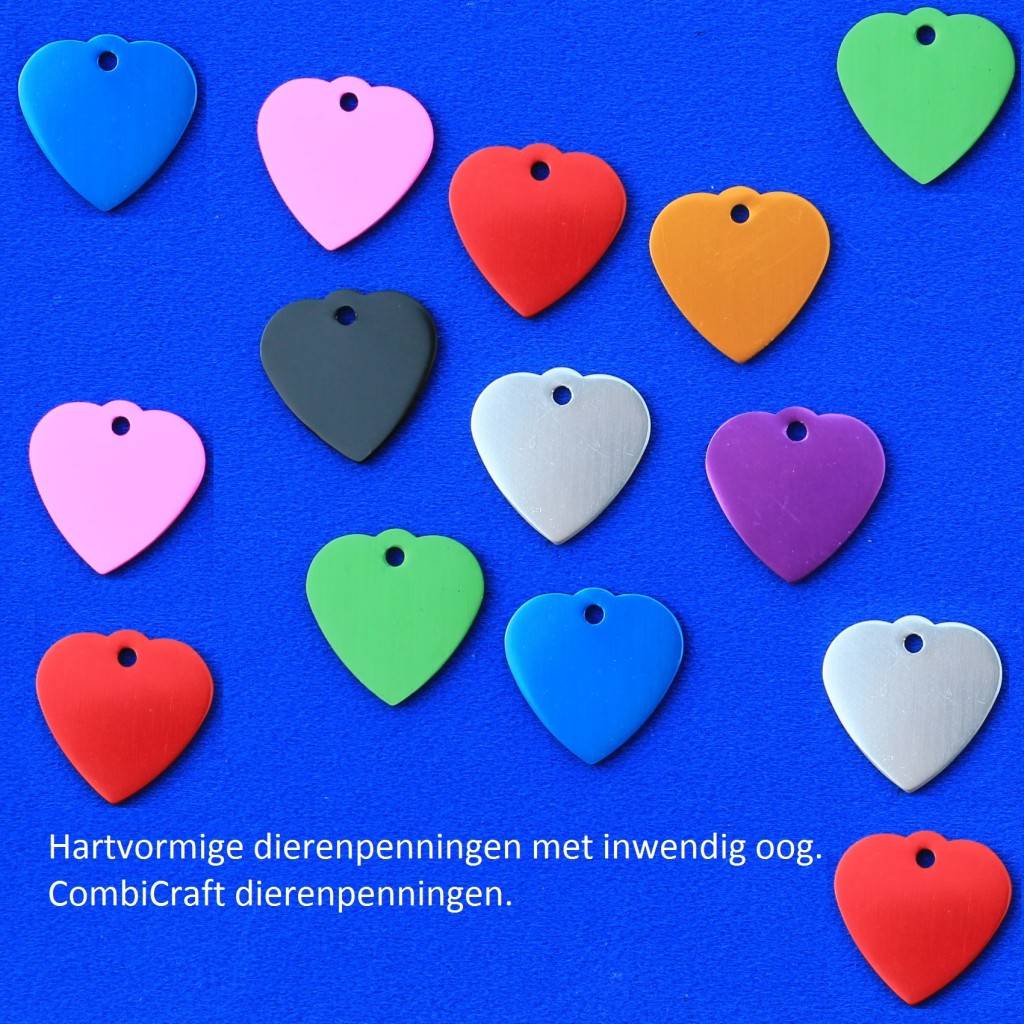 Aluminium hartvormige dierenpenning met een inwendig oog. Deze penning van ongeveer 29x29mm is verkrijgbaar in diverse kleuren. Er is ruimte voor maximaal 12 karakters gravering op de voor- en achterzijde.