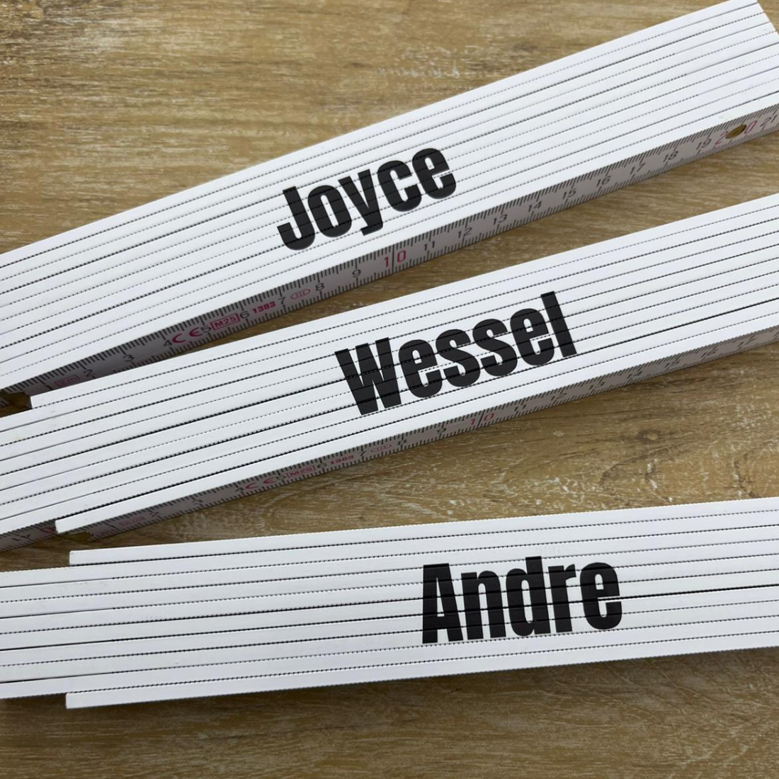 Laat de duimstok bedrukken met een eigen naam in zwart. Vul in het daarvoor bestemde veld de gewenste naam of tekst in. De naam wordt enkelzijdig op de duimstok gedrukt. Wil je meerdere namen of teksten laten bedrukken? Plaats ze dan onder elkaar in een Excel-bestand en stuur het bestand, onder vermelding van je ordernummer, naar [email protected].