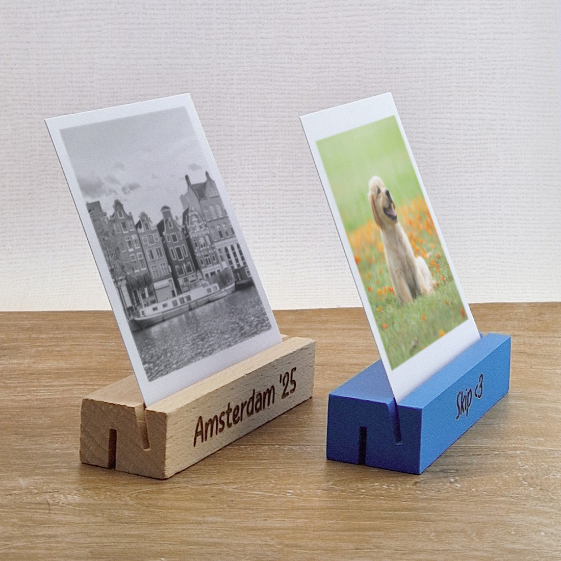 De houten fotohouder met eigen tekstgravering is breed inzetbaar. Plaats er bijvoorbeeld een (polaroid)foto, kaart, geboortekaart of ansichtkaart in. Je kunt er allerlei soorten foto’s of kaarten in kwijt. Leuk om zelf te gebruiken of om cadeau te geven met een persoonlijke tekst die past bij de ontvanger.