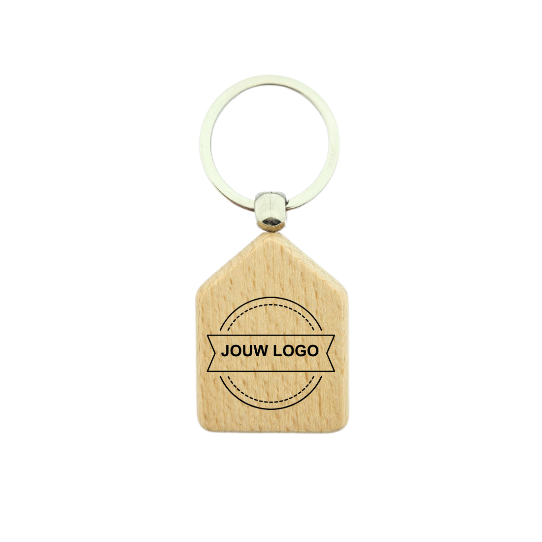 Houten sleutelhanger huis met logo 35x45mm - per 1 stuk
