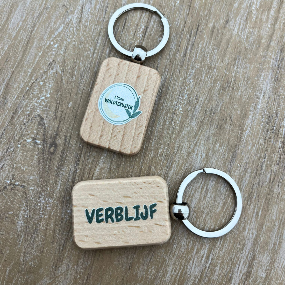 Betaalbare houten sleutelhanger met logo vanaf 1 stuk. Laat jouw logo full colour bedrukken op deze kleine rechthoekige houten sleutelhanger. Een leuke giveaway voor bedrijven in allerlei sectoren.