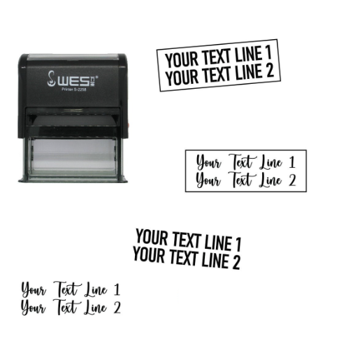 Gepersonaliseerde tekst stempel met jouw eigen tekst op 2 regels. Er zijn 4 verschillende modellen mogelijk. De stempel heeft een drukvlak van ca 27x10mm. De stempel heeft een intern stempelkussen, je hebt dus verder geen extern inktkussen meer nodig. Kleur van de afdruk is zwart.