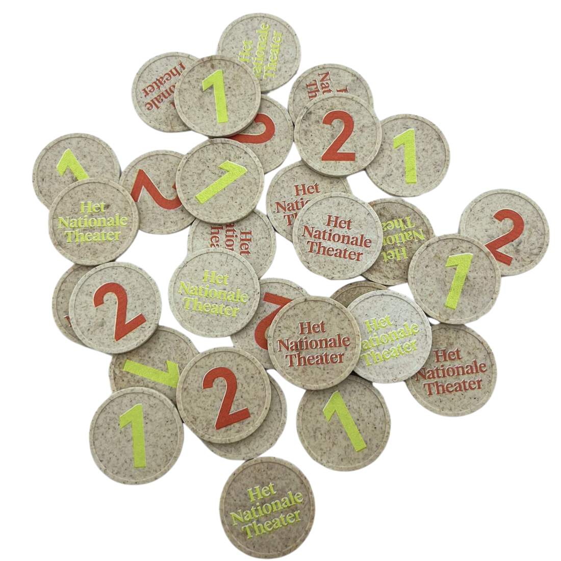 De munten hebben een doorsnede van 29 mm en een dikte van 2,35 mm. Let op: omdat dit een natuurproduct is, kunnen de afmetingen iets van elkaar verschillen. De munten zijn gemaakt van houtvezels en hars, allebei 100% biologisch afbreekbaar. Dit is naast milieuvriendelijk, ook een mooi, sterk en glad materiaal! De munten worden verkocht per 100 stuks. Om het uitgeven en organiseren van munten soepel te laten verlopen, kun je gebruikmaken van kunststof telbakken.
