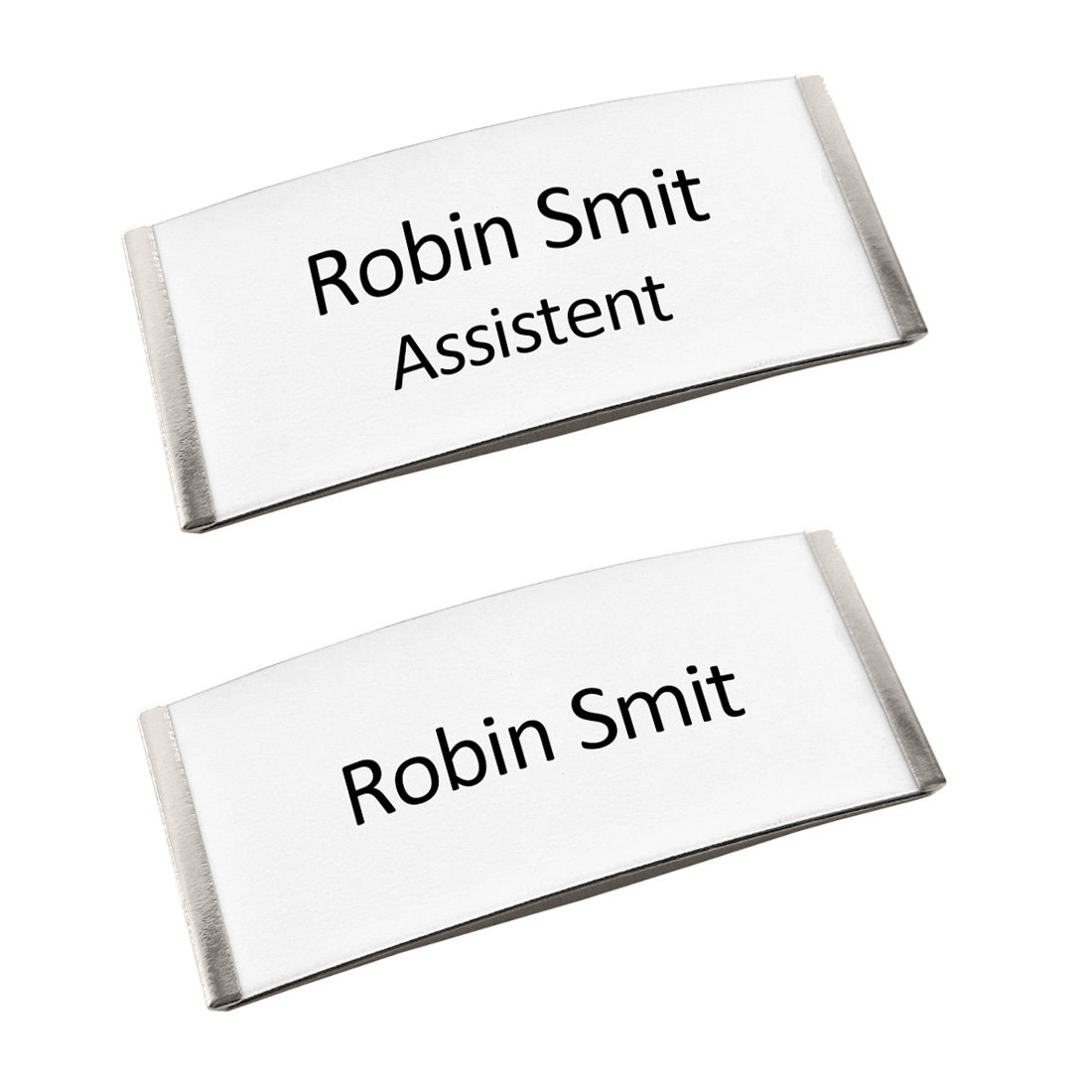 De Easy3 naambadge heeft een afmeting van 77 x 32 mm en bestaat uit een zilverkleurig kunststof profiel met daarin een gekleurd kunststof plaatje. Je kunt kiezen uit wit, zilver of zwart, waarop één of twee regel tekst worden gegraveerd. Dit kan bijvoorbeeld een naam, functietitel, quote of andere korte tekst zijn. Vul de gewenste tekst in bij de daarvoor bestemde velden. Aan de achterzijde bevindt zich een brochespeld, waarmee je de badge eenvoudig op kleding bevestigt. Om de naambadge te beschermen tegen beschadigingen, kun je optioneel een opbergdoosje meebestellen.