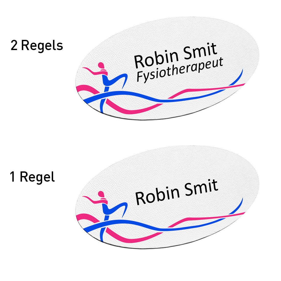Deze ovale naambadge is speciaal ontworpen voor professionals binnen en rond de fysiotherapie. Denk aan fysiotherapeuten, assistenten of administratief personeel. Zo maak je jezelf eenvoudig kenbaar. Je cliënten zien in één oogopslag wie je bent en kunnen je makkelijk aanspreken.