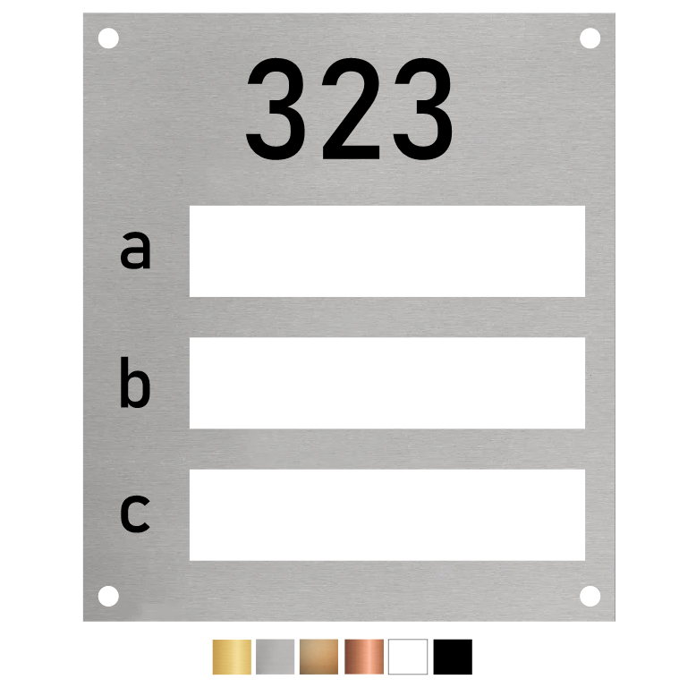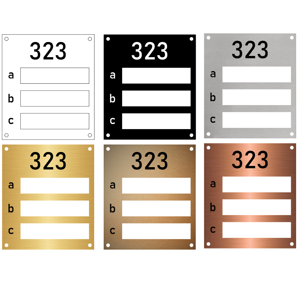 | Maat: | 105x120mm en 3.2mm dik; de vensters zijn 78x18mm, er is ruimte voor 3 naamplaatjes van 80x20mm. |