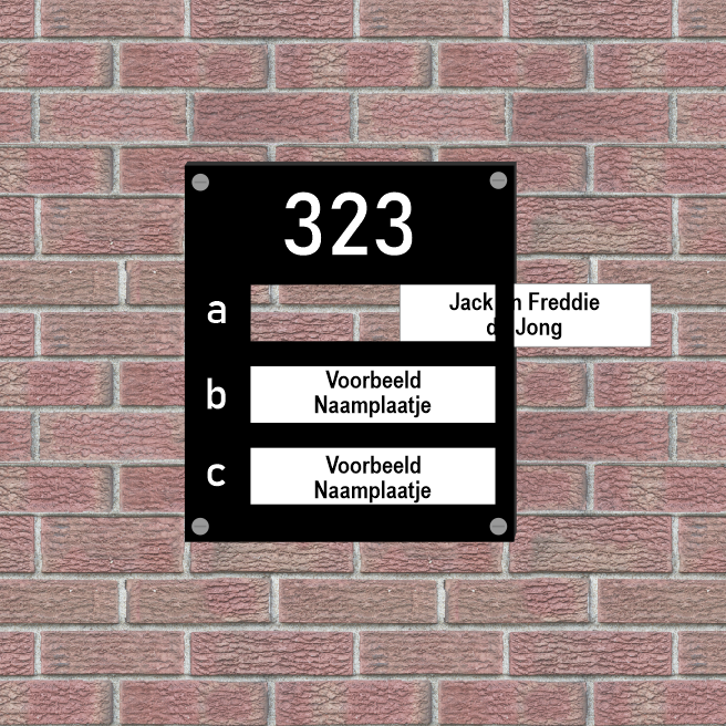 De naamplaathouder wordt gemaakt van UV-bestendig Acrylaat (kunststof) en kan gebruikt worden in alle weersomstandigheden. Naast het huisnummer dat groot bovenaan gegraveerd wordt, kunnen er naast de naamplaatjes ook extensies worden weergegeven, zoals a, b, c of 1, 2, 3.