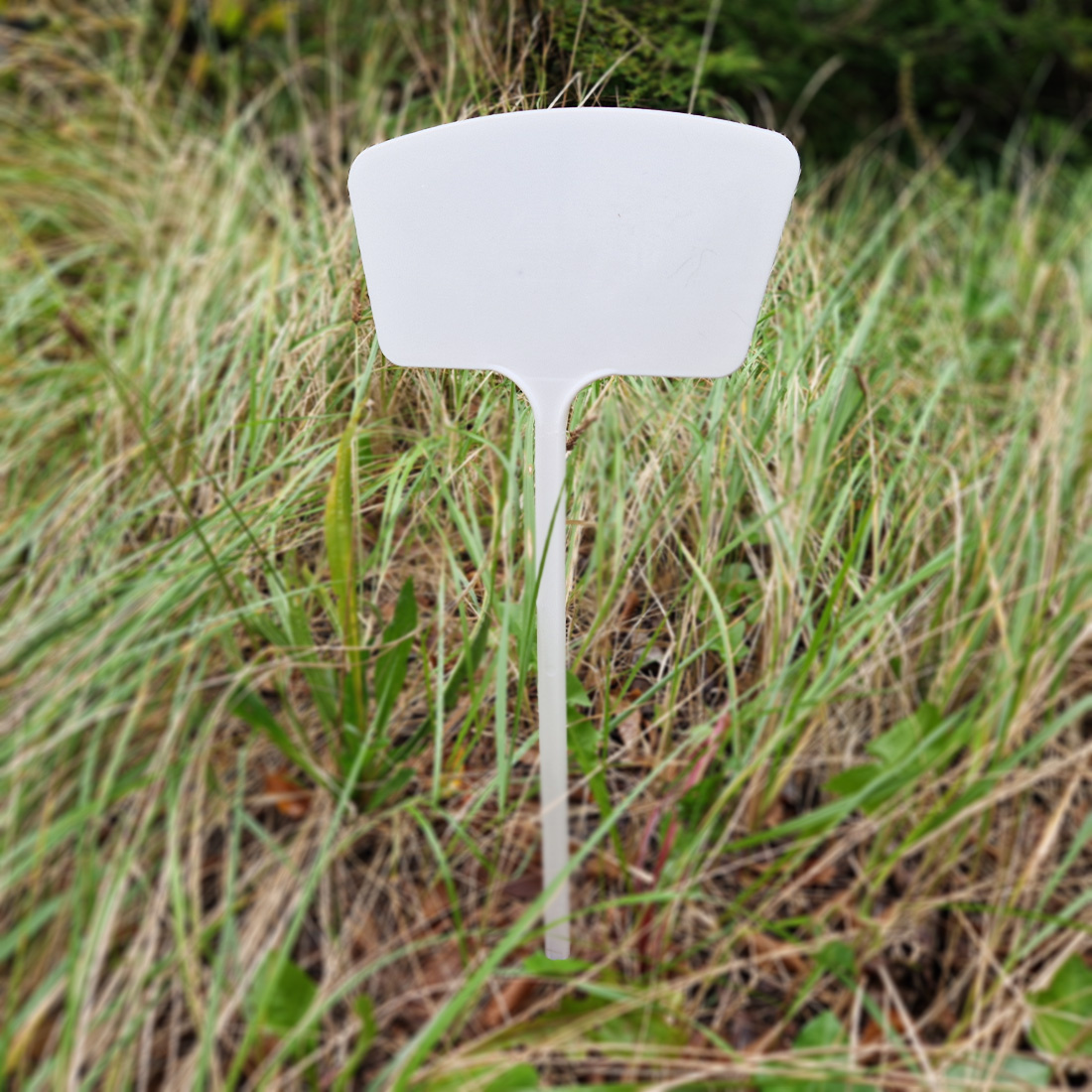 De witte plaatetiketten met afgeronde hoeken zijn gemaakt van kunststof en hebben een lengte van 450 mm. Het bordje heeft afmetingen van 190 x 100 mm en kan worden bestickerd of beschreven met een watervaste stift. De etiketten zijn UV- en waterbestendig en daardoor geschikt voor binnen- en buitengebruik. Aan de onderzijde bevindt zich een punt, waardoor je ze eenvoudig in de grond of in een pot kunt steken. De plaatetiketten zijn per 10 stuks te bestellen.