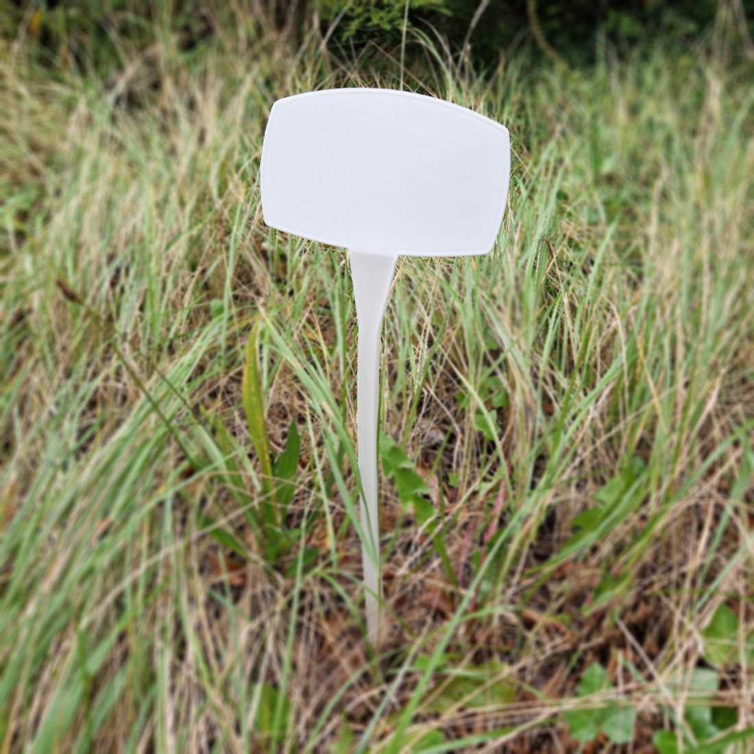 De witte plaatetiketten met afgerond hoeken en knik zijn gemaakt van kunststof en hebben een lengte van 500 mm. Het bordje heeft afmetingen van 150 x 90 mm en kan worden bestickerd of beschreven met een watervaste stift. De etiketten zijn UV- en waterbestendig en daardoor geschikt voor binnen- en buitengebruik. Aan de onderzijde bevindt zich een punt, waardoor je ze eenvoudig in de grond of in een pot kunt steken. De plaatetiketten zijn per 10 stuks te bestellen.