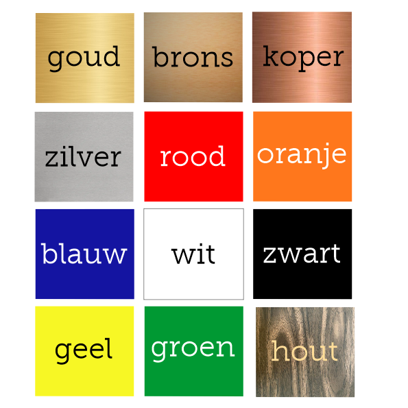 Plaatjes hebben een ge-eloxeerde top- en onderlaag van een UV- en Corrosie bestendige acrylaat. Ideaal voor binnen- en buitengebruik. Sterk, op maat gemaakt en relatief goedkoop. Deze plaatjes zijn per stuk te bestellen en worden geheel op maat gemaakt.