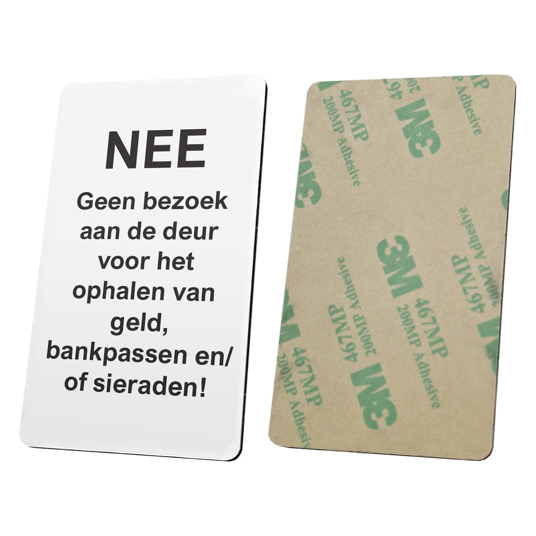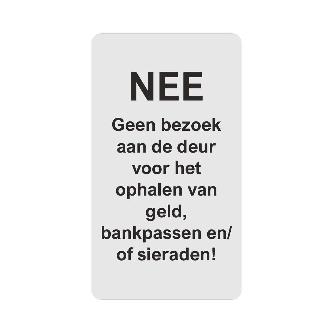 Deurbordje met daarop de tekst: NEE! Geen bezoek aan de deur voor het ophalen van geld, bankpassen en/of sieraden! Het bordje geeft aan dat er niet wordt opengedaan voor oplichters en nepagenten die bijvoorbeeld babbeltrucs gebruiken om geld, bankpassen of andere waardevolle spullen af te nemen.