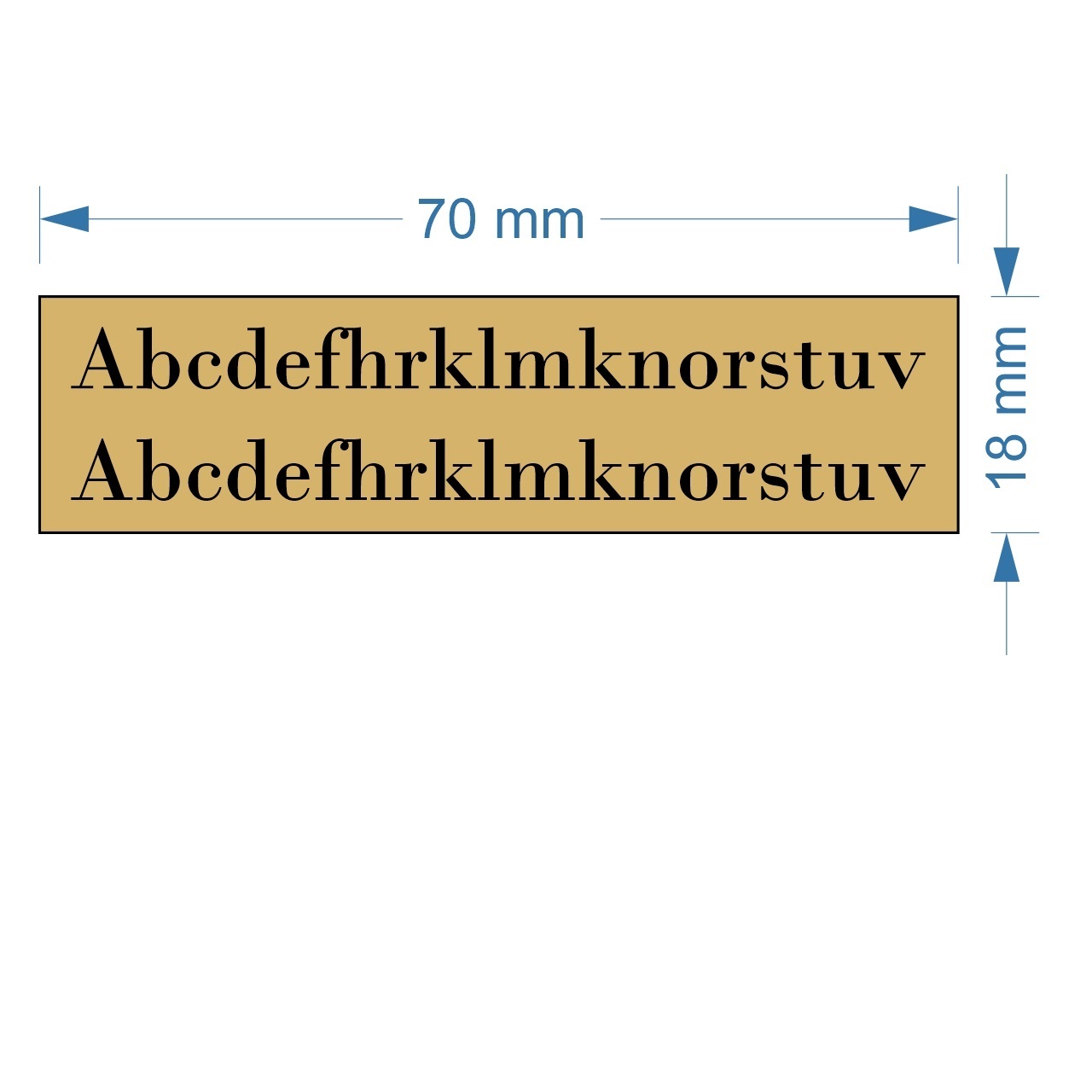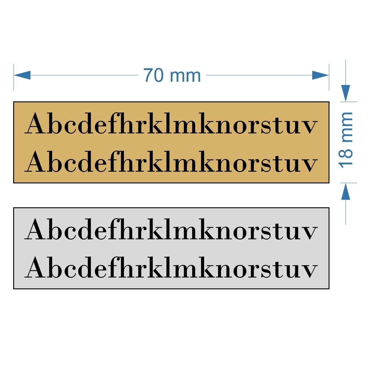 Messing of RVS-look Acrylaat 70 x 18mm rechte hoeken Tape afgewerkt. Gravering op 1 of 2 regels Bodoni MT Normaal 20PT Max 19 Karakters (incl. Spaties) zwarte gravering |