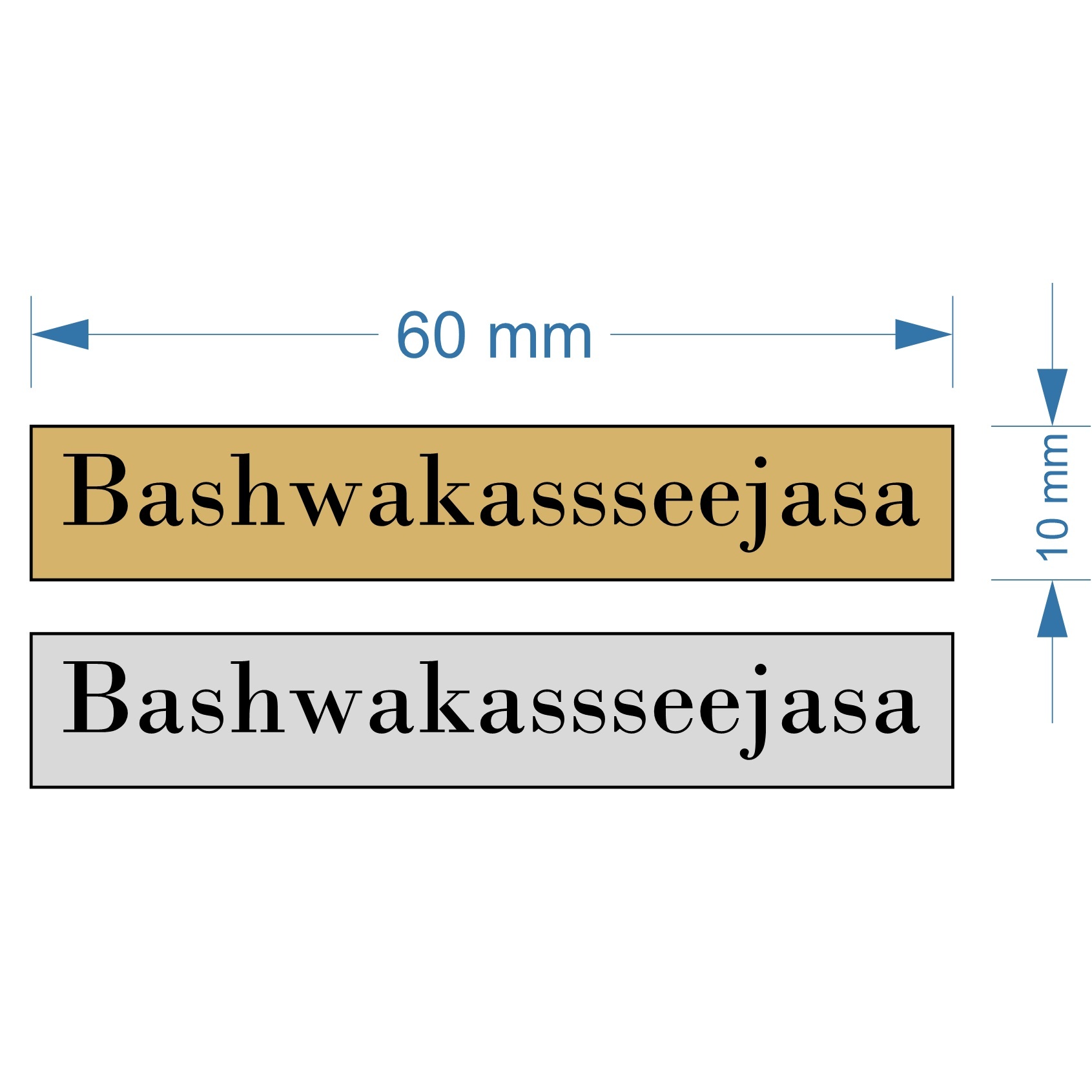 | Messing of RVS-look Acrylaat 60 x 10mm rechte hoeken Tape afgewerkt. Gravering op 1 regel Bodoni MT Normaal 20PT 17 Karakters inclusief Spaties zwarte gravering |