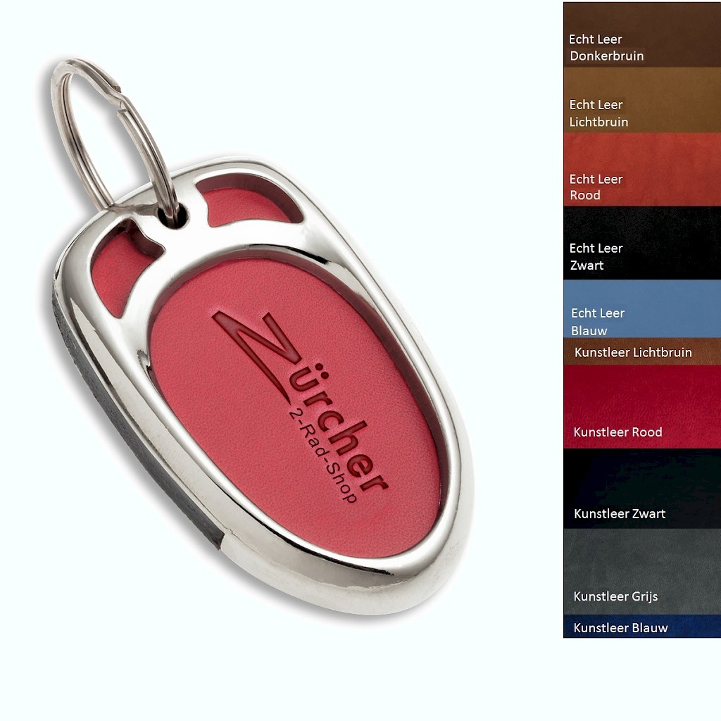 Deze metaalprofiel sleutelhanger van 40 x 86 mm, kan voorzien worden van een ingebrand logo aan beide zijde van de sleutelhanger op echt leer of op kunstleer. Zie voorbeelden van een ingebrand logo. Het toevoegen van individuele nummers is mogelijk, maar niet noodzakelijk. De sleutelhanger is voorzien van een stevige sleutelring. Er is ook een kunstlederen uitvoering.
