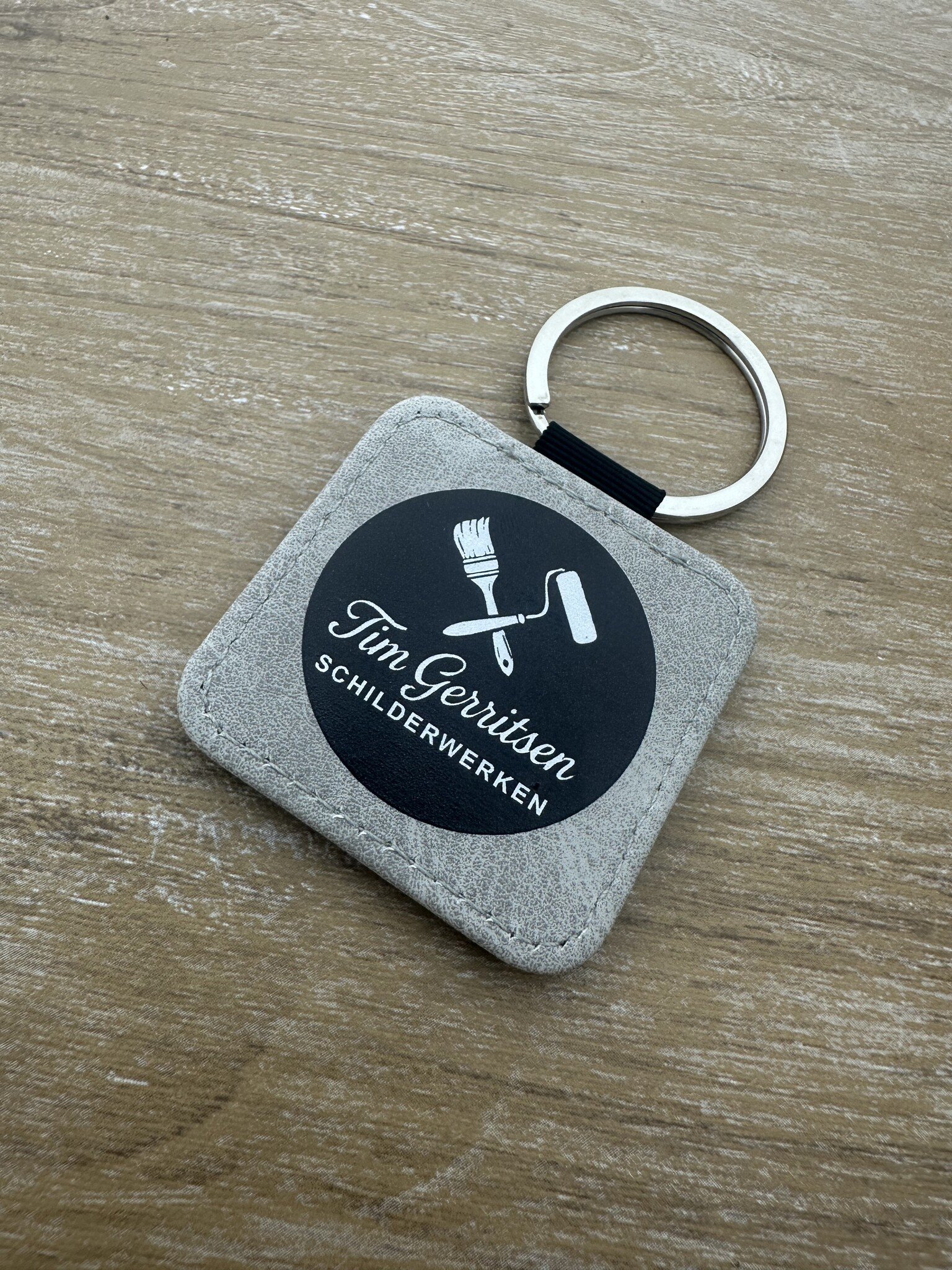 Leren sleutelhanger vierkant met logo in lichtgrijs 50x50mm - per 1 stuk