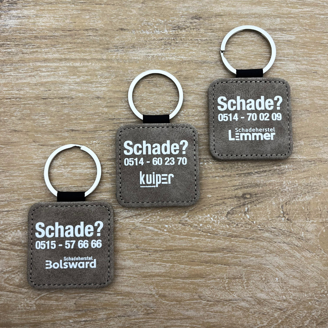 Leren sleutelhanger vierkant met logo in grijs 50x50mm - per 1 stuk