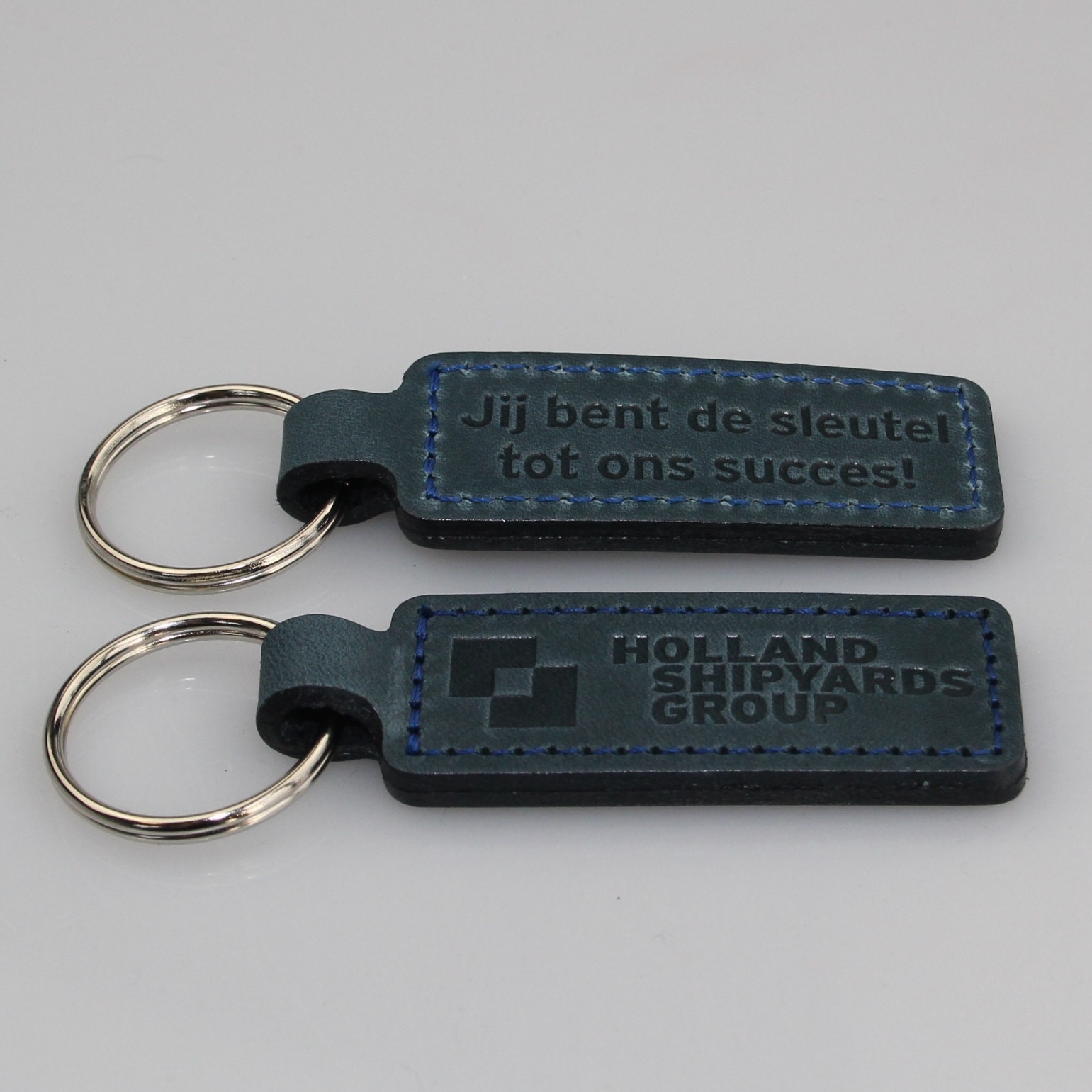 Brandlogo op sleutelhangers van leer.