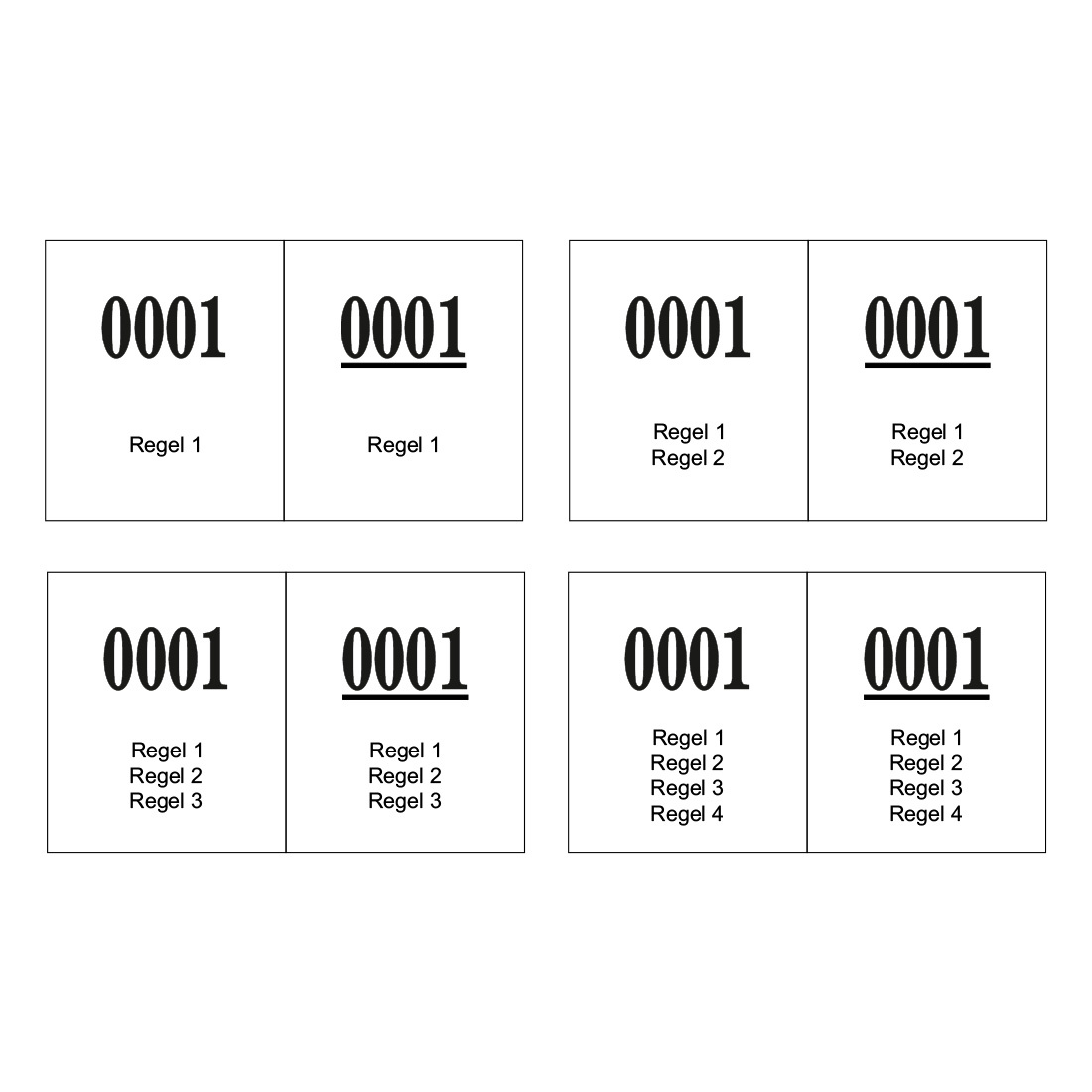 De nummers in de boekjes zijn doorlopend en beginnen van 0001 tot 1000. Bestel je bijvoorbeeld 4 x 1000 loten? Dan ontvang je de nummering van 0001 tot 4000. De nummers worden duidelijk zichtbaar in zwart gedrukt. Bestel je meerdere kleuren? Dan begint de nummering per kleur opnieuw bij 0001. Wil je een andere nummering ontvangen? Geef dit dan aan in het opmerkingenveld. Let op: hierdoor vervalt wel het retourbeleid.