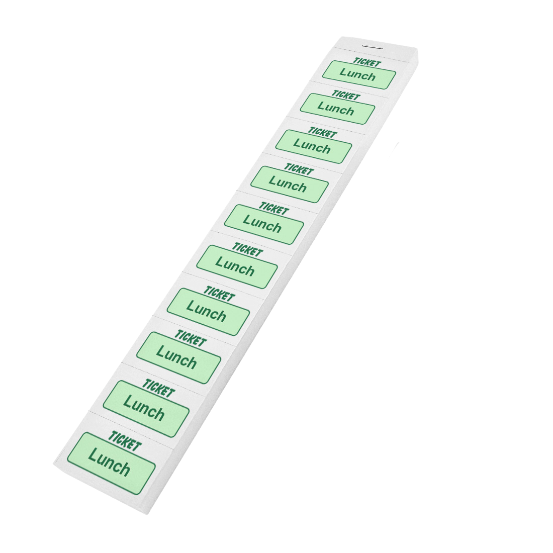 De witte bonnen hebben een groene opdruk en bevatten de tekst ticket en lunch. Elke bon heeft een afmeting van 50 x 27,5 mm. Ze zijn gemaakt van 160 gr/m² papier, wat ervoor zorgt dat ze niet gemakkelijk vocht opnemen. De bonnen zijn verdeeld over twee boekjes van 50 x 285 x 10 mm, waarbij elk boekje 50 strips bevat met op elke strip 10 consumptiebonnen. In totaal ontvang je 1000 bonnen, die dankzij de perforatiestrook eenvoudig van elkaar af te scheuren zijn.
