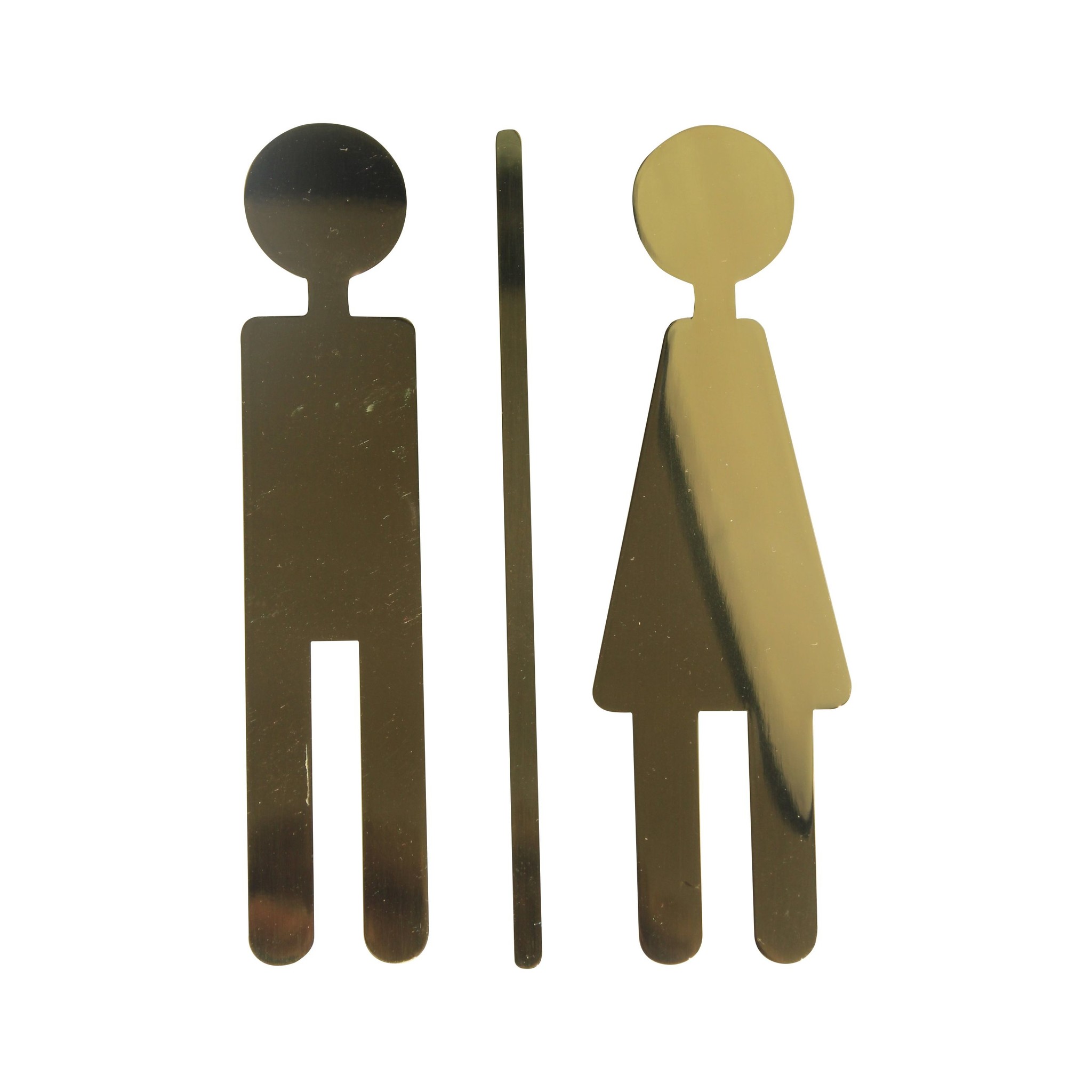 Symbool voor algemeen toilet, douche of kleedruimte. Symbool bestaat uit een man, vrouw en scheidingslijn ertussen. Symbool is gemaakt van glanzend messing en is 150mm hoog. Bevestiging kan door het symbool te lijmen of kitten.