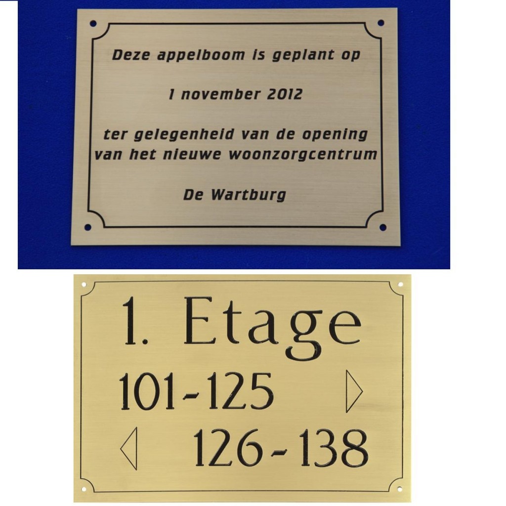 Deurbordjes, Gevelbordjes, Muurbordjes en Informatiebordjes van door en door massief Messing. Mooi materiaal, voorzien van een gravure, waarbij de gravure zwart ingelakt wordt. Het messing krijgt een laklaag ter bescherming.