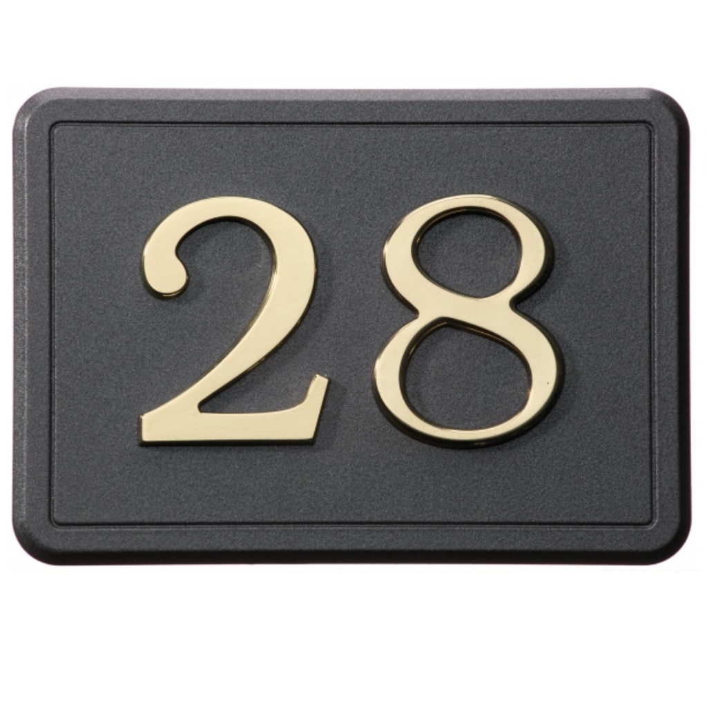 Gepolijst glimmende messing huisnummers geplaatst op een antracietmessing achtergrond in 140x100mm met rand.