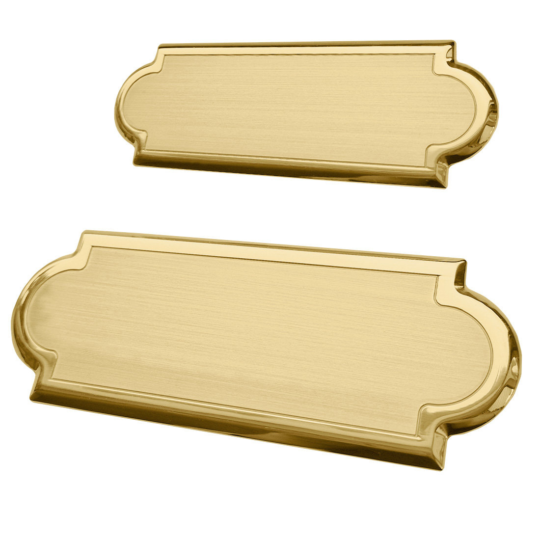 De messing Velinia naambordjes zijn verkrijgbaar in de maten 125 x 45 mm en 145 x 55 mm en hebben een dikte van 3 mm. Het bordje van 125 x 45 mm heeft een gewicht van 120 gram en het bordje van 145 x 55 mm heeft een gewicht van 171 gram. Ze zijn gemaakt van hoogwaardig, glanzend messing en hebben een luxe uitstraling. Daarnaast hebben ze een duidelijke en sierlijke rand.