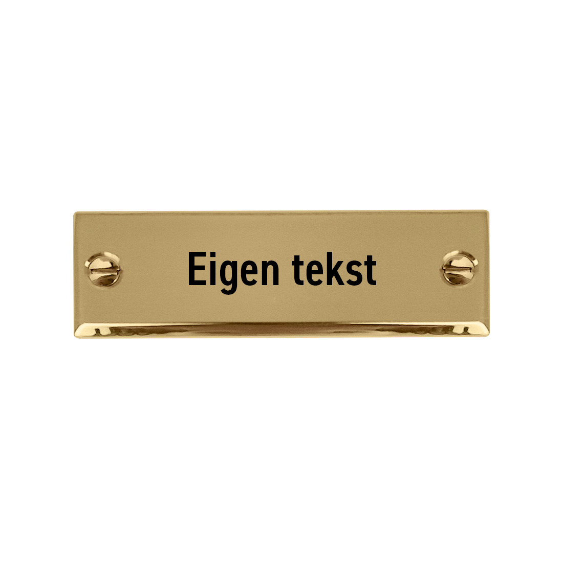Het naamplaatje is gemaakt van glanzend messing en heeft een afmeting van 60 x 20 mm en een dikte van 2 mm. Het is voorzien van twee gaten en wordt geleverd met bijpassende schroeven. Zo kun je het gemakkelijk bevestigen op het gewenste oppervlak. Het is mogelijk om het naamplaatje te personaliseren met één of twee regels tekst. De tekst wordt zwart gegraveerd met behulp van lasergravering. Vul in de daarvoor bestemde velden de gewenste tekst in.