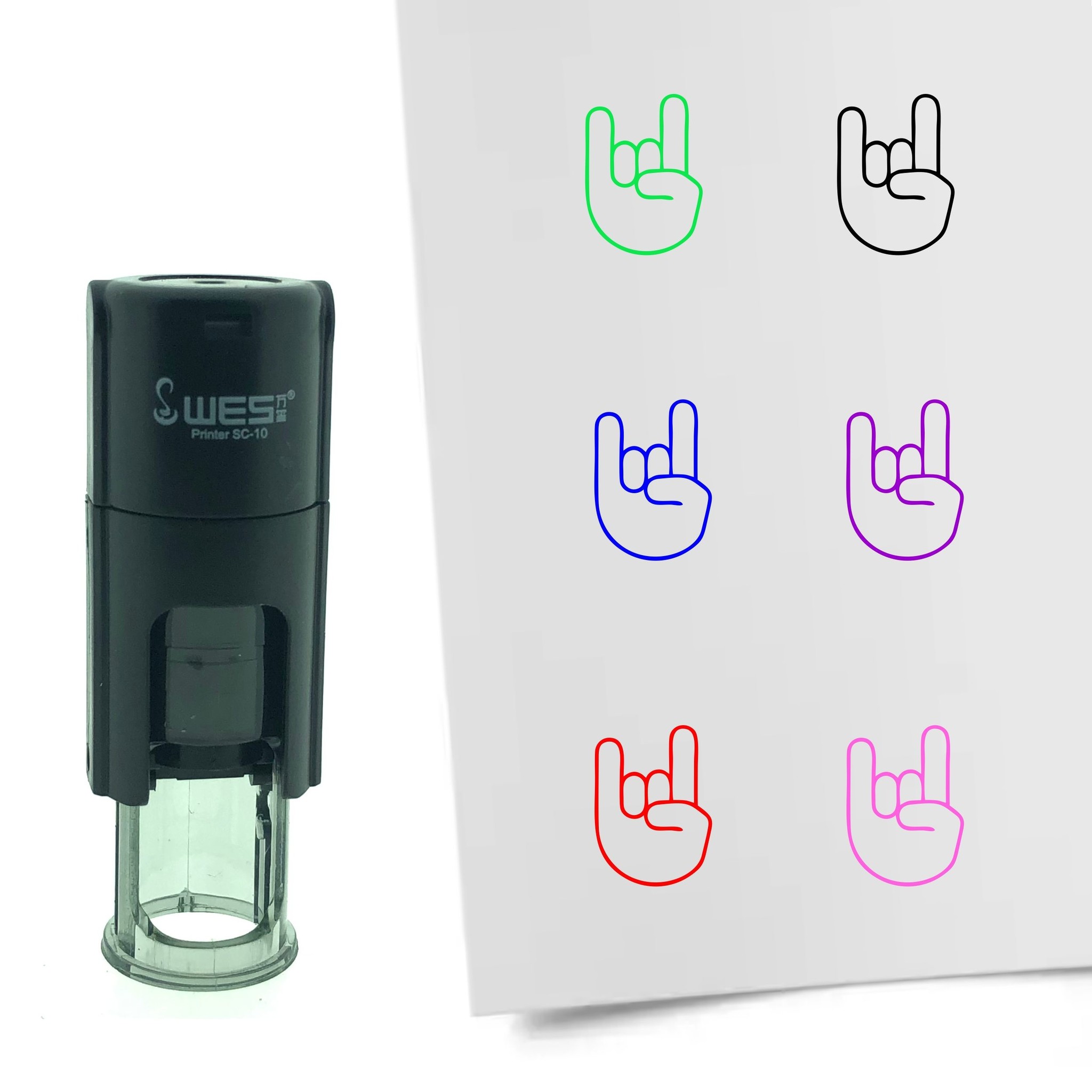 Stempel of stempeltje van 1cm rond in de vorm van de emoji metal horn / rock. Stempel kan gebruikt worden voor stempelen van spaarkaarten of stempelkaarten. Stempel bevat een inktkussen dus geen extern inktkussen nodig.