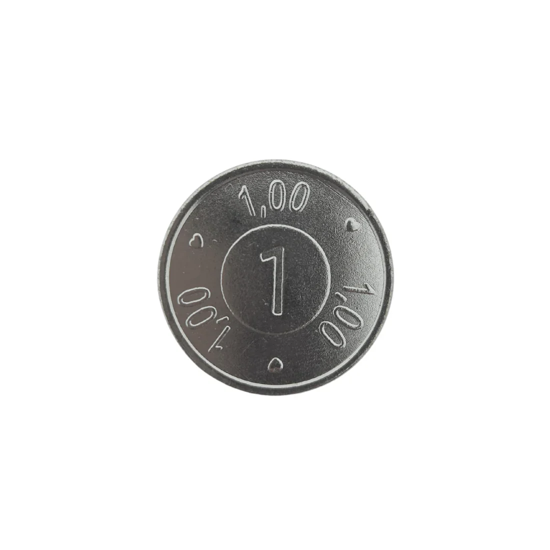 De munt is gemaakt van sterk staal en heeft een doorsnede van Ø23mm, wat gelijk staat aan een €1 munt. De munten worden verkocht in een verpakking van 100 stuks. Aan de voor- en achterzijde is het ontwerp van een 1 gegraveerd.