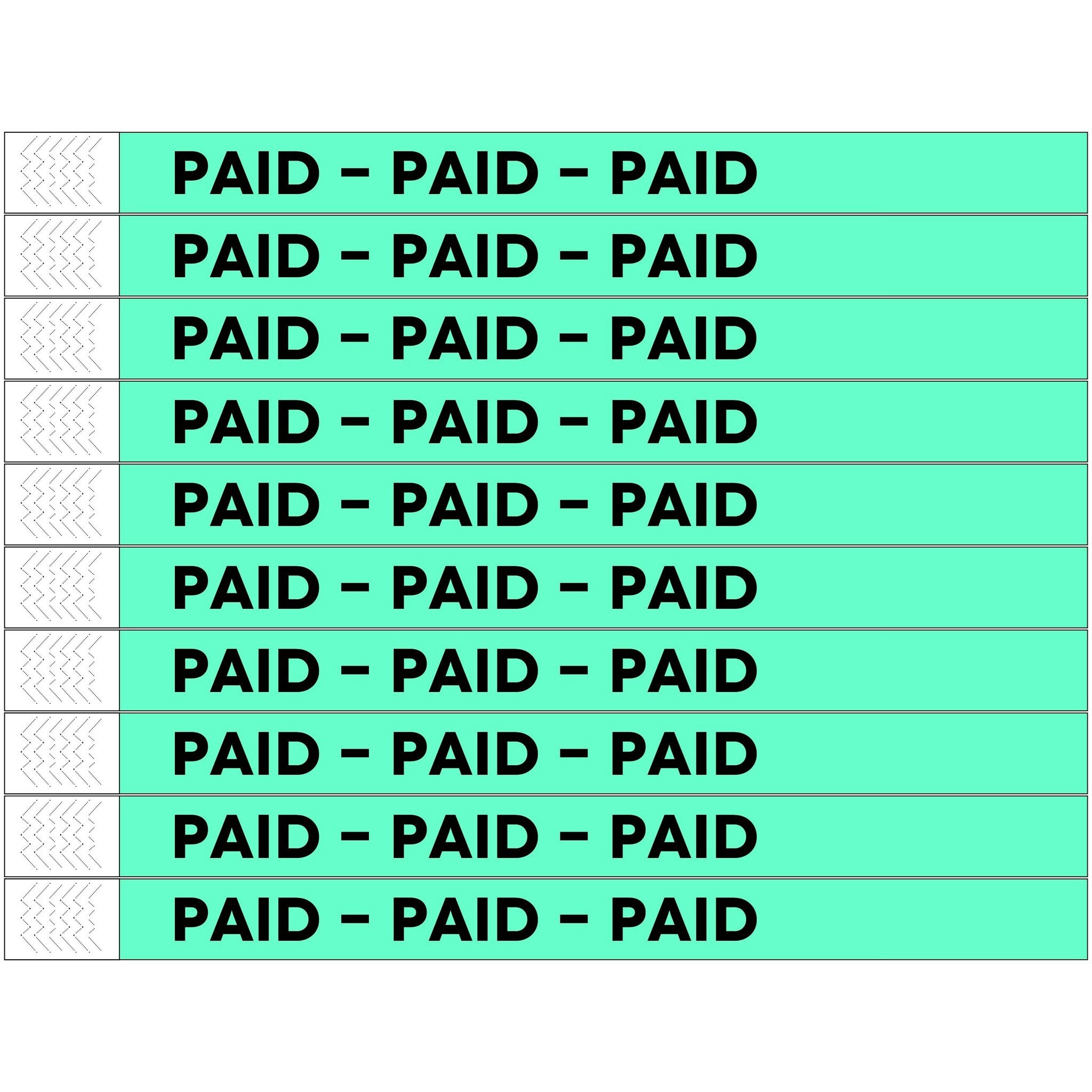 De Tyrex polsbandjes zijn zwart bedrukt met de tekst ‘Paid’ en hebben afmetingen van 248 x 19 mm. Ze zijn voorzien van een nummering en een sterke plakstrook met veiligheidsbevestiging. Zowel kinderen als volwassenen kunnen deze polsbandjes dragen. De polsbandjes worden geleverd op vellen, waarbij de bandjes gemakkelijk van elkaar los te scheuren zijn. Je ontvangt 10 vellen met op elk vel 10 bandjes. In totaal ontvang je 100 polsbandjes. Daarnaast is het mogelijk om de bandjes extra te beschrijven met een balpen of een watervaste stift.