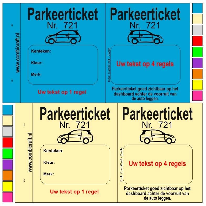 | Kleuren: | De Parkeertickets hebben wij beschikbaar in de kleuren rood, eigeel, groen, blauw, oranje, violet, pastelgeel, lichtgrijs en fuchia. (De kleuren op de afbeelding zijn illustratief) |