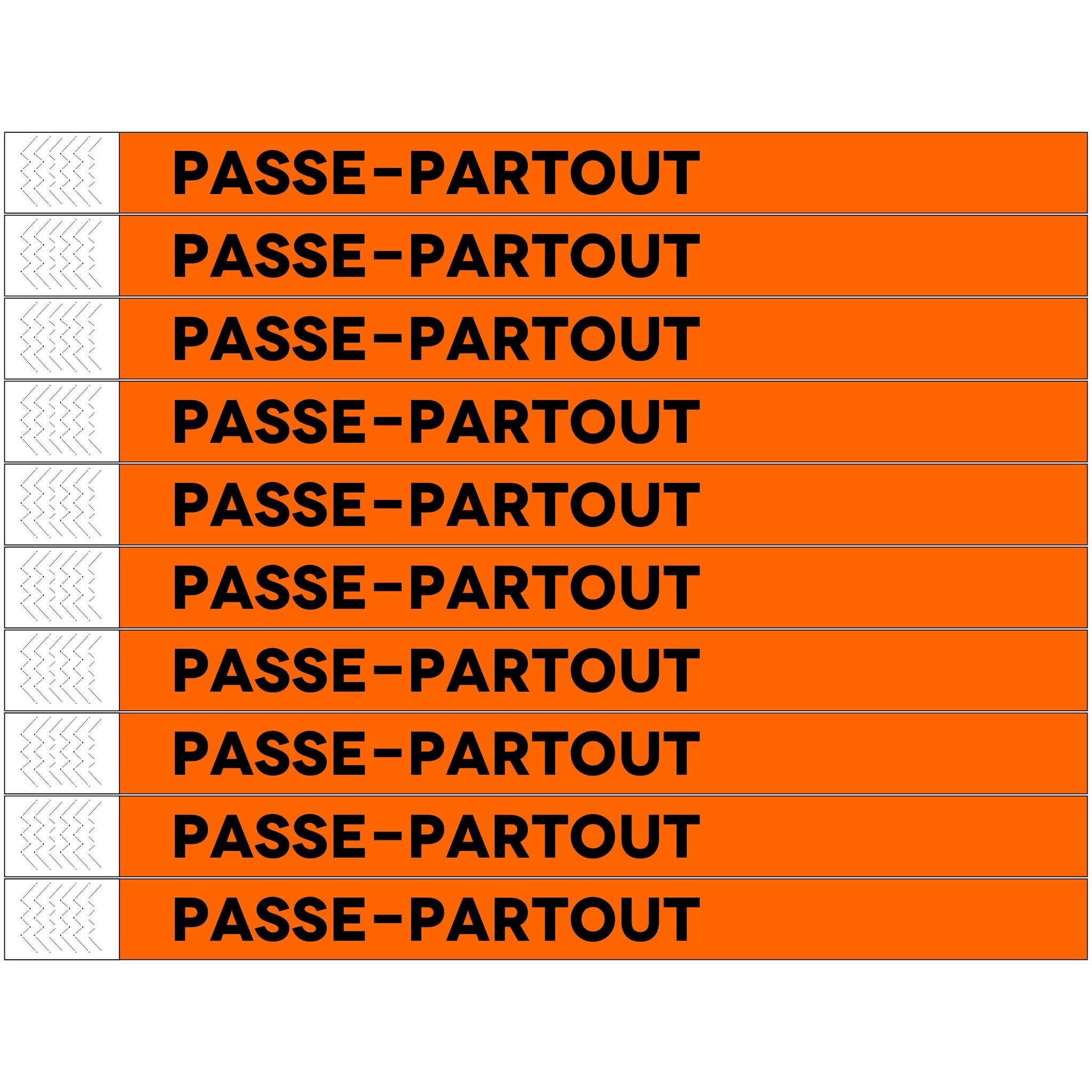 De Tyrex polsbandjes zijn zwart bedrukt met de tekst ‘Passe-partout’ en hebben afmetingen van 248 x 19 mm. Ze zijn voorzien van een nummering en een sterke plakstrook met veiligheidsbevestiging. Zowel kinderen als volwassenen kunnen deze polsbandjes dragen. De polsbandjes worden geleverd op vellen, waarbij de bandjes gemakkelijk van elkaar los te scheuren zijn. Je ontvangt 10 vellen met op elk vel 10 bandjes. In totaal ontvang je 100 polsbandjes. Daarnaast is het mogelijk om de bandjes extra te beschrijven met een balpen of een watervaste stift.