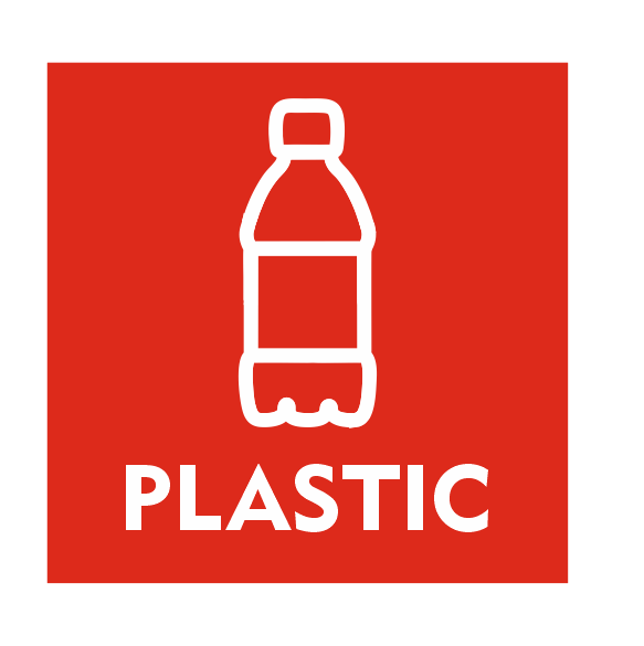 Bordjes voor afvalscheiding. Een pictogrambordje met een symbool specifiek voor weggooien plastic. Bordjes zijn beschikbaar met boorgaten of dubbelzijdige tape.