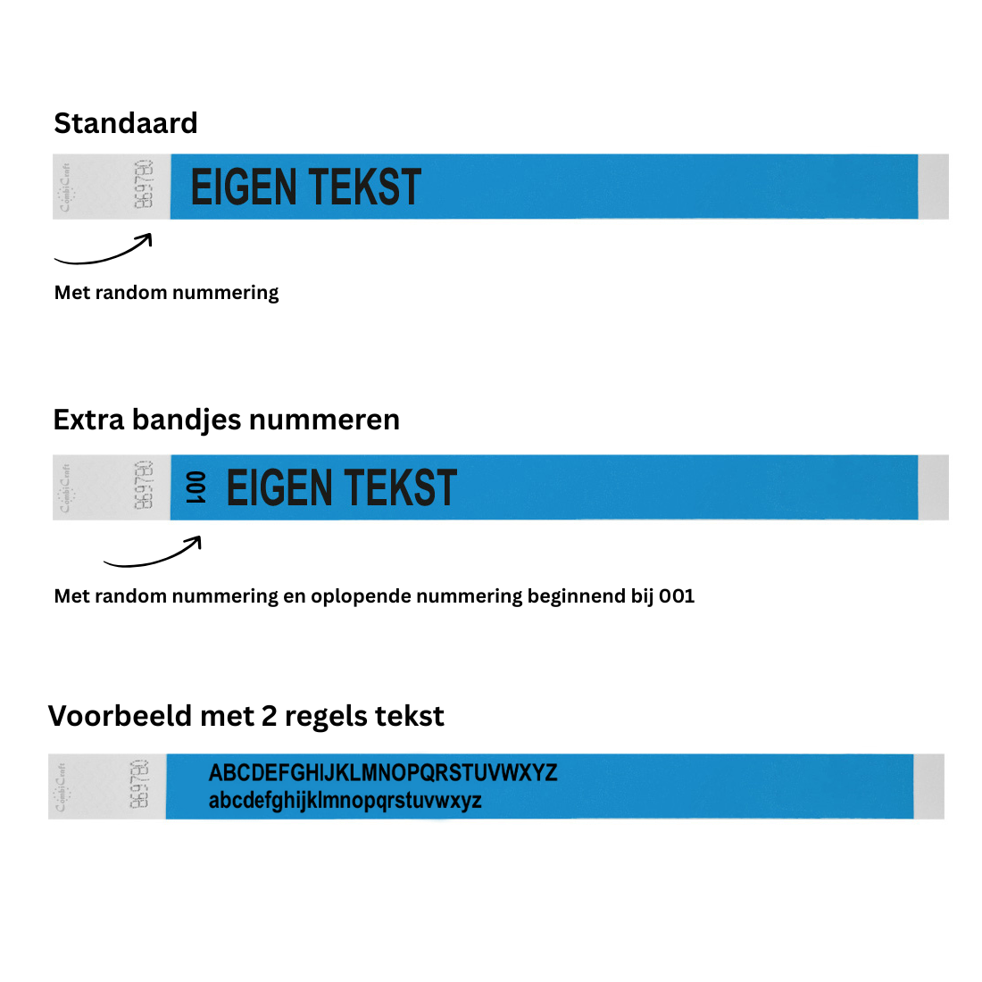 *Wil je een extra doorlopende nummering op de bandjes (zie afbeeldingen)? Geef dit dan aan bij het keuzeveld. Wij brengen hier €1,00 extra voor in rekening. De nummering start bij 001 en eindigt bij het aantal polsbandjes je bestelt. Bestel je bijvoorbeeld 500 polsbandjes? Dan ontvang je de nummering 001 tot 500.